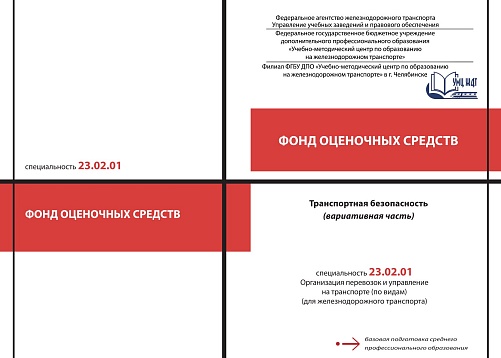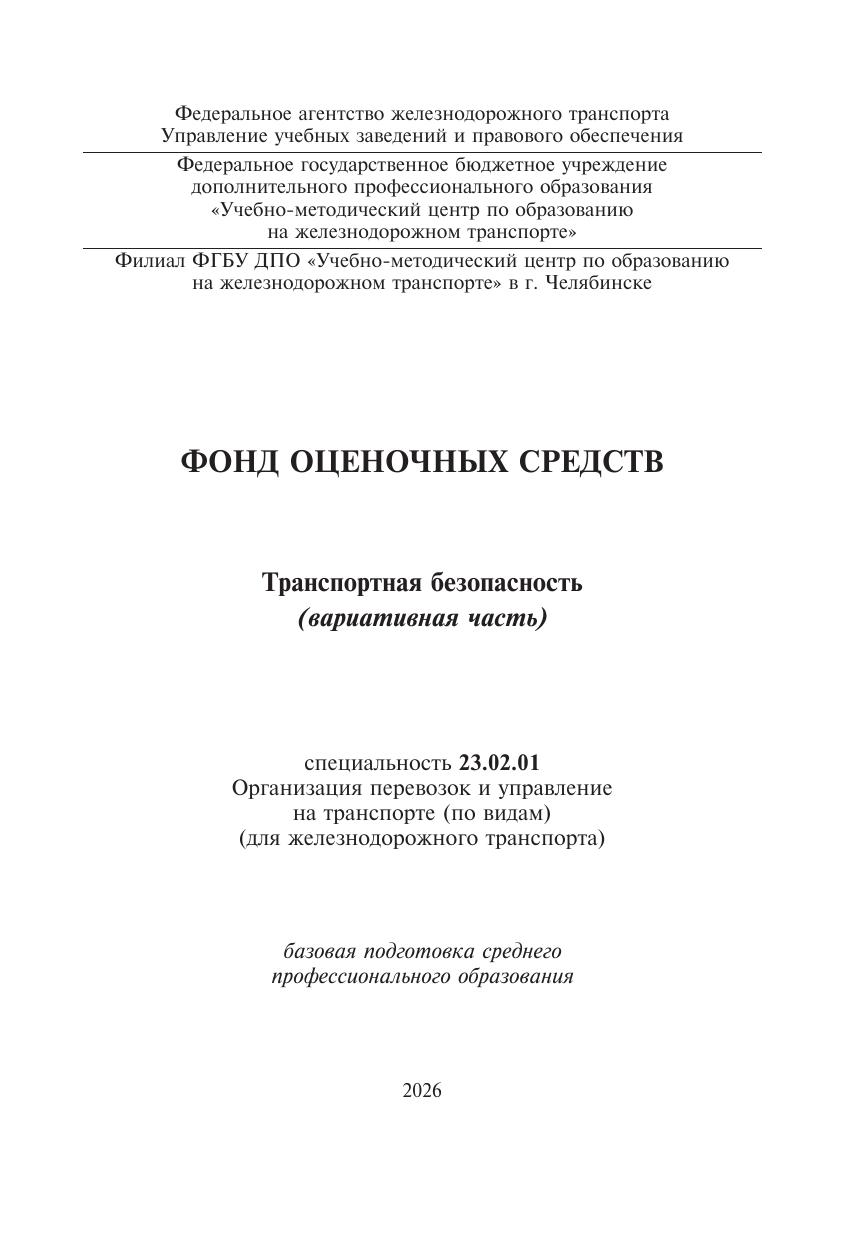 Агафонова, Н.Ю. Фонд оценочных средств по учебной дисциплине Транспортная безопасность (вариативная часть) : методическое пособие / Н. Ю. Агафонова. — Москва : УМЦ ЖДТ, 2026. — 160 с. — Текст : электронный // УМЦ ЖДТ : электронная библиотека. — URL: https://umczdt.ru/books/1265/300652/ (дата обращения 29.04.2026). — Режим доступа: по подписке.