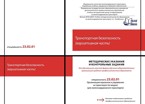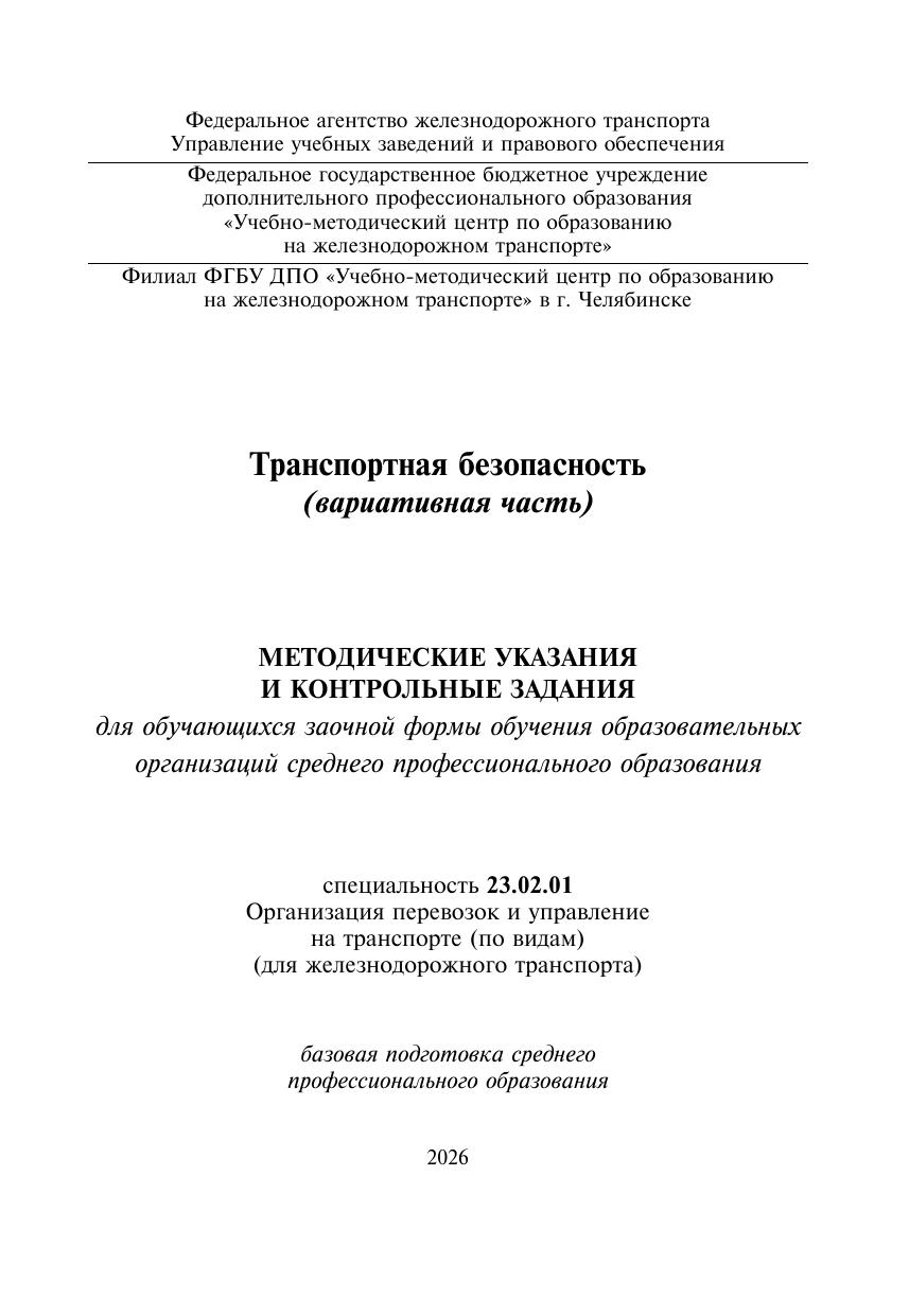 Агафонова, Н.Ю. Методические указания и контрольные задания для обучающихся заочной формы обучения образовательных организаций среднего профессионального образования по учебной дисциплине Транспортная безопасность (вариативная часть) : методическое пособие / Н. Ю. Агафонова. — Москва : УМЦ ЖДТ, 2026. — 68 с. — Текст : электронный // УМЦ ЖДТ : электронная библиотека. — URL: https://umczdt.ru/books/1265/300664/ (дата обращения 27.04.2026). — Режим доступа: по подписке.