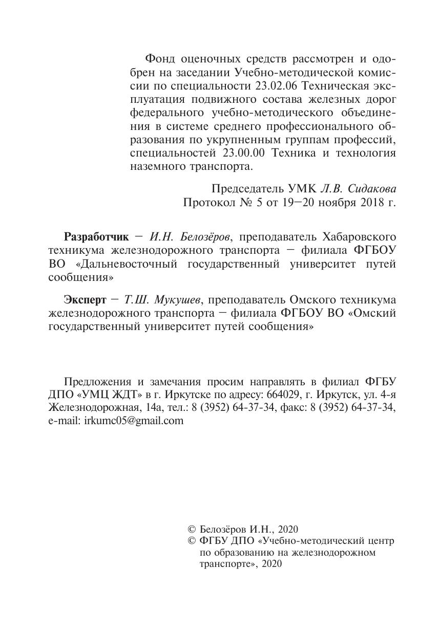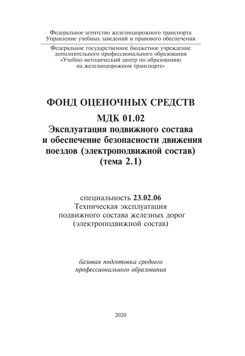 Белозеров, И.Н. Фонд оценочных средств МДК 01.02 Эксплуатация подвижного состава и обеспечение безопасности движения поездов (электроподвижной состав) (тема 2.1) : методическое пособие / И. Н. Белозеров. — Москва : ФГБУ ДПО «Учебно методический центр по образованию на железнодорожном транспорте», 2020. — 60 с. — Текст : электронный // УМЦ ЖДТ : электронная библиотека. — URL: https://umczdt.ru/books/1232/239718/ (дата обращения 29.04.2026). — Режим доступа: по подписке.