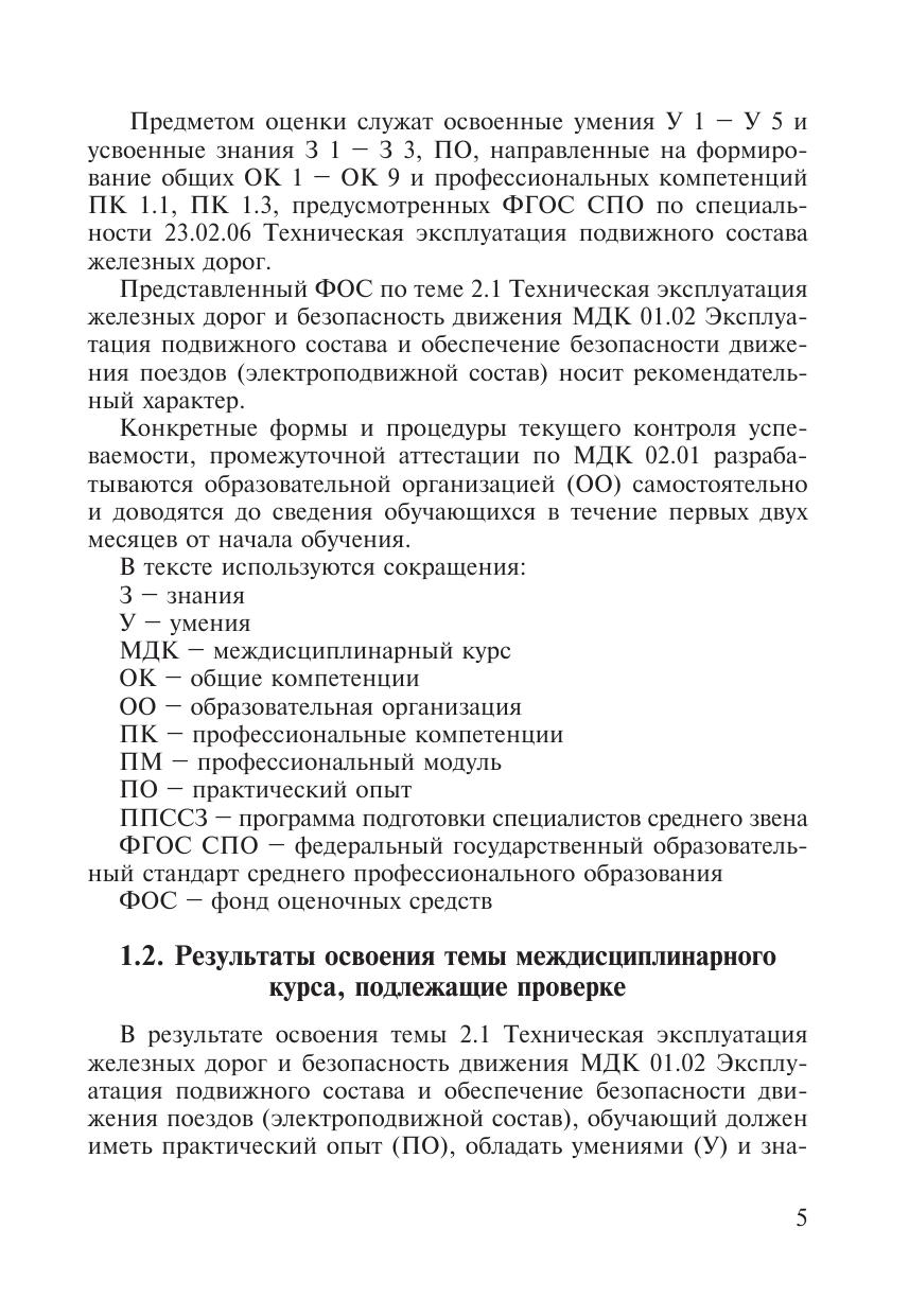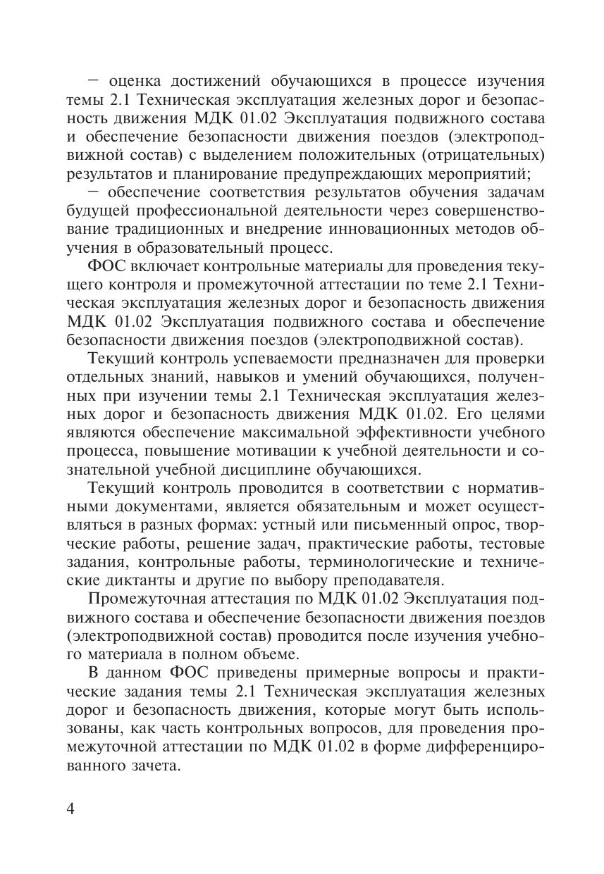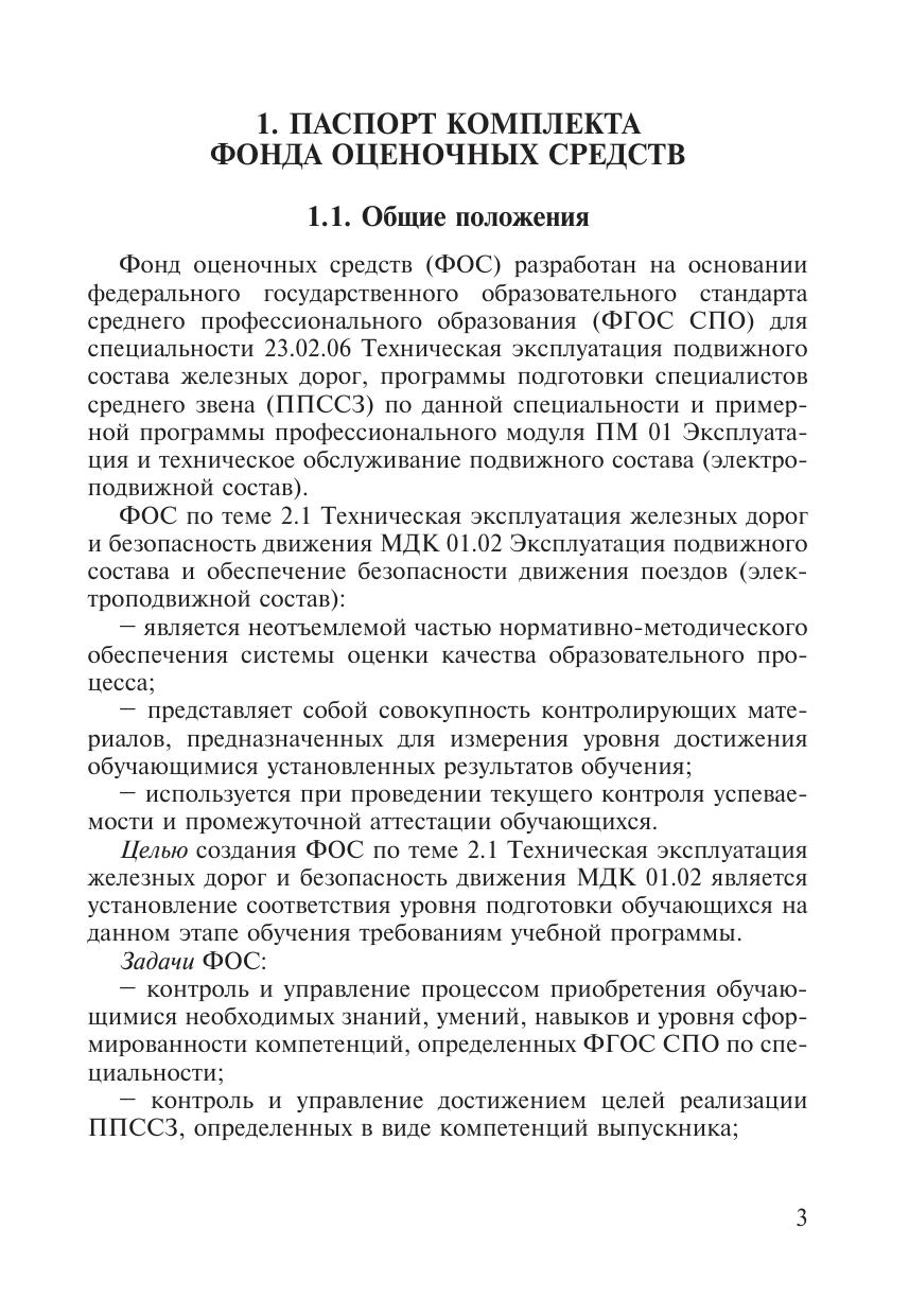 Фонд оценочных средств разработан на основании ФГОС СПО для специальности 23.02.06 Техническая эксплуатация подвижного состава железных дорог, программы подготовки специалистов среднего звена  по данной специальности и примерной программы ПМ 01 Эксплуатация и техническое обслуживание подвижного состава (электроподвижной состав). ФОС по теме 2.1 Техническая эксплуатация железных дорог и безопасность движения МДК 01.02 Эксплуатация подвижного состава и обеспечение безопасности движения поездов (электроподвижной состав) является неотъемлемой частью нормативно-методического обеспечения системы оценки качества образовательного процесса, представляет собой совокупность контролирующих материалов, предназначенных для измерения уровня достижения обучающимися установленных результатов обучения, используется при проведении текущего контроля успеваемости и промежуточной аттестации обучающихся.