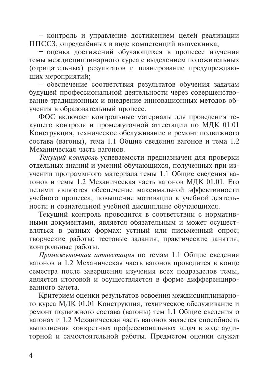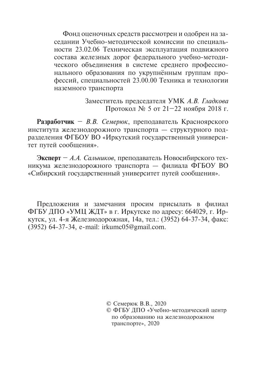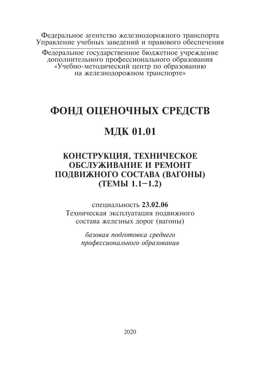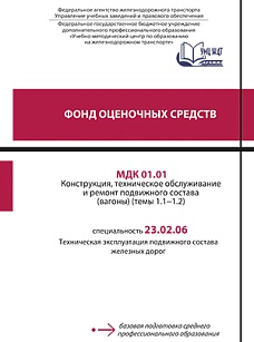 Семерюк, В.В. Фонд оценочных средств МДК 01.01 Конструкция, техническое обслуживание и ремонт подвижного состава (вагоны) (темы 1.1-1.2) : методическое пособие / В. В. Семерюк. — Москва : ФГБУ ДПО «Учебно методический центр по образованию на железнодорожном транспорте», 2020. — 91 с. — Текст : электронный // УМЦ ЖДТ : электронная библиотека. — URL: https://umczdt.ru/books/1232/239728/ (дата обращения 29.04.2026). — Режим доступа: по подписке.