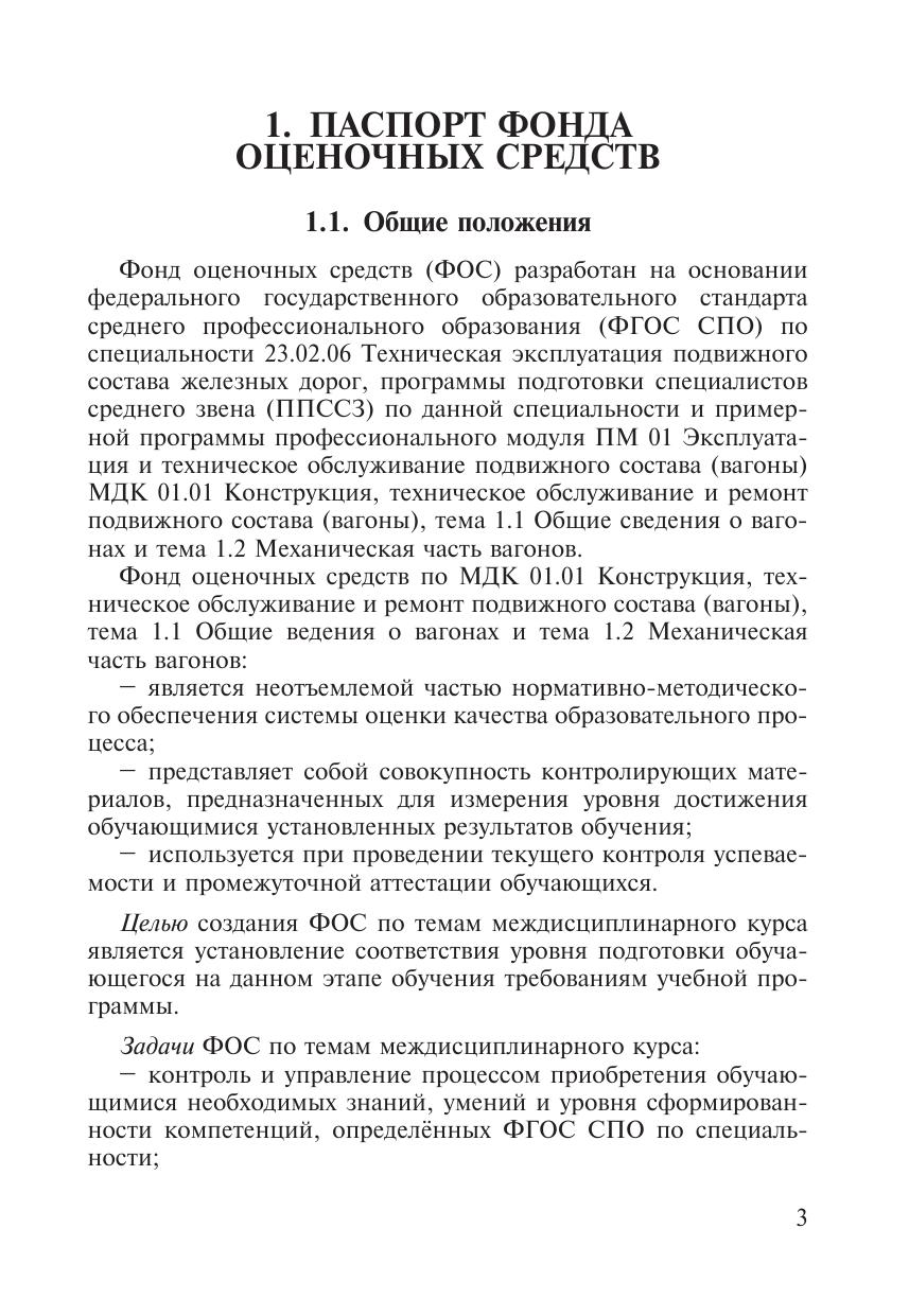 Фонд оценочных средств  разработан на основании ФГОС СПО по специальности 23.02.06 Техническая эксплуатация подвижного состава железных дорог, программы подготовки специалистов среднего звена по данной специальности и примерной программы ПМ 01 Эксплуатация и техническое обслуживание подвижного состава (вагоны) МДК 01.01 Конструкция, техническое обслуживание и ремонт подвижного состава (вагоны), тема 1.1 Общие сведения о вагонах и тема 1.2 Механическая часть вагонов. ФОС  является неотъемлемой частью нормативно-методического обеспечения системы оценки качества образовательного процесса, представляет собой совокупность контролирующих материалов, предназначенных для измерения уровня достижения обучающимися установленных результатов обучения,используется при проведении текущего контроля успеваемости и промежуточной аттестации обучающихся.