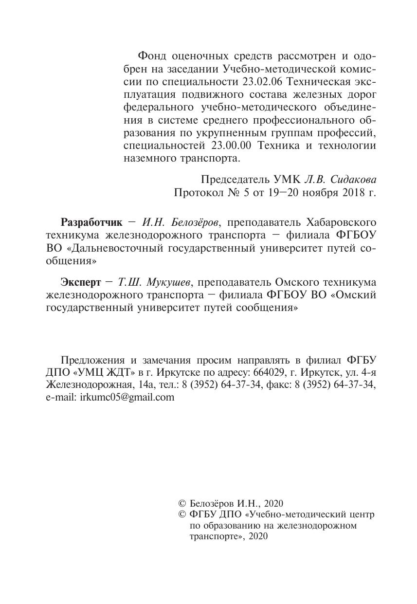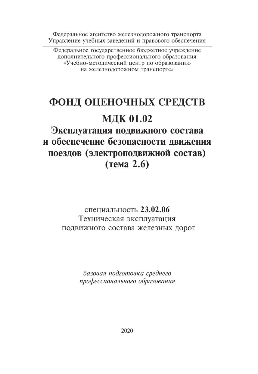 Белозеров, И.Н. Фонд оценочных средств МДК 01.02 Эксплуатация подвижного состава и обеспечение безопасности движения поездов (электроподвижной состав) (тема 2.6) : методическое пособие / И. Н. Белозеров. — Москва : ФГБУ ДПО «Учебно методический центр по образованию на железнодорожном транспорте», 2020. — 52 с. — Текст : электронный // УМЦ ЖДТ : электронная библиотека. — URL: https://umczdt.ru/books/1232/240087/ (дата обращения 29.04.2026). — Режим доступа: по подписке.