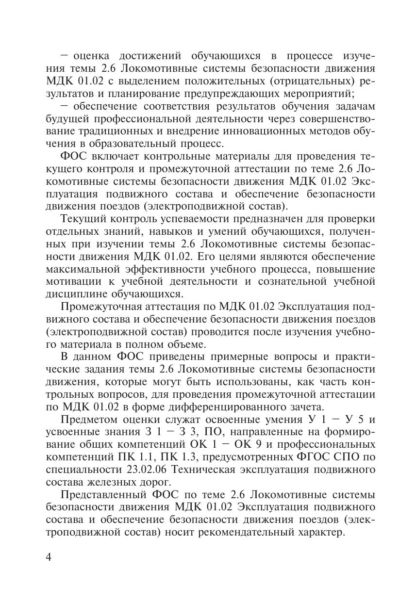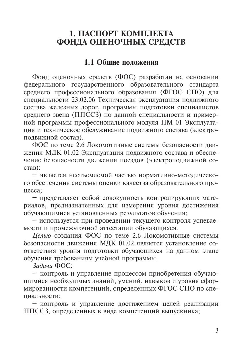 Фонд оценочных средств  разработан на основании ФГОС СПО для специальности 23.02.06 Техническая эксплуатация подвижного состава железных дорог, программы подготовки специалистов среднего звена  по данной специальности и примерной программы  ПМ 01 Эксплуатация и техническое обслуживание подвижного состава (электроподвижной состав) МДК 01.02 Эксплуатация подвижного состава и обеспечение безопасности движения поездов (электроподвижной состав) (тема  2.6 Локомотивные системы безопасности движения). ФОС является неотъемлемой частью нормативно-методического обеспечения системы оценки качества образовательного процесса, представляет собой совокупность контролирующих материалов, предназначенных для измерения уровня достижения обучающимися установленных результатов обучения, используется при проведении текущего контроля успеваемости и промежуточной аттестации обучающихся.