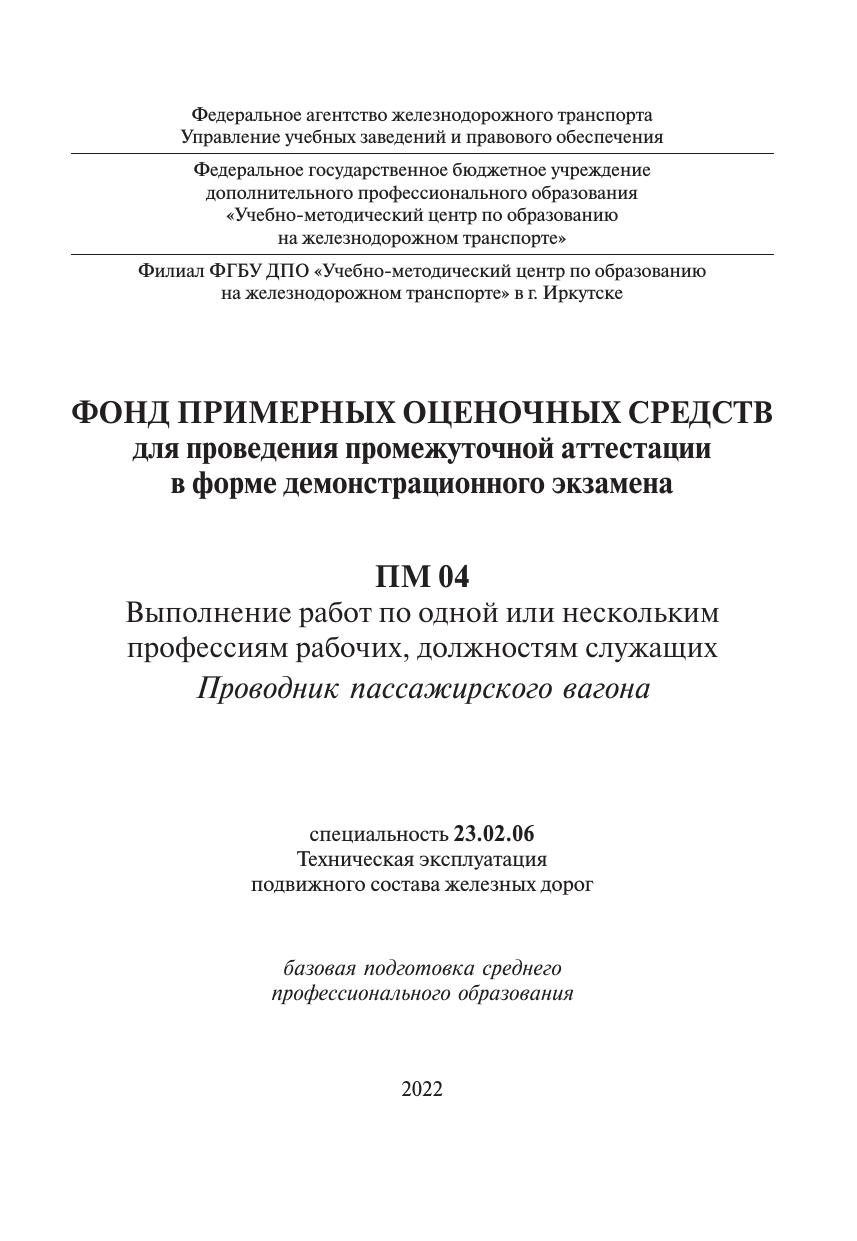 Фонд примерных оценочных средств для проведения промежуточной аттестации в форме демонстрационного экзамена ПМ О4 Выполнение работ по одной или нескольким профессиям рабочих, должностям служащих Проводник пассажирского вагона