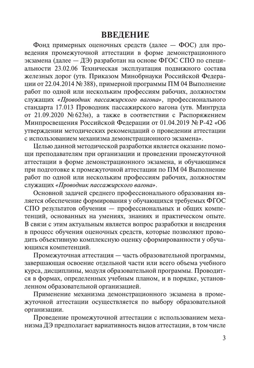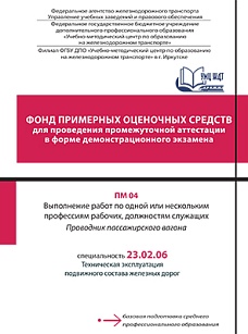 ФОС для проведения промежуточной аттестации в форме ДЭ разработан на основе ФГОС СПО по специальности 23.02.06 Техническая эксплуатация подвижного состава железных дорог, ПП ПМ 04 Выполнение работ по одной или нескольким профессиям рабочих, должностям служащих «Проводник пассажирского вагона», ПС 17.013 Проводник пассажирского вагона. Целью разработки является оказание помощи преподавателям при организации и проведении ДЭ и обучающимся при подготовке к экзамену.