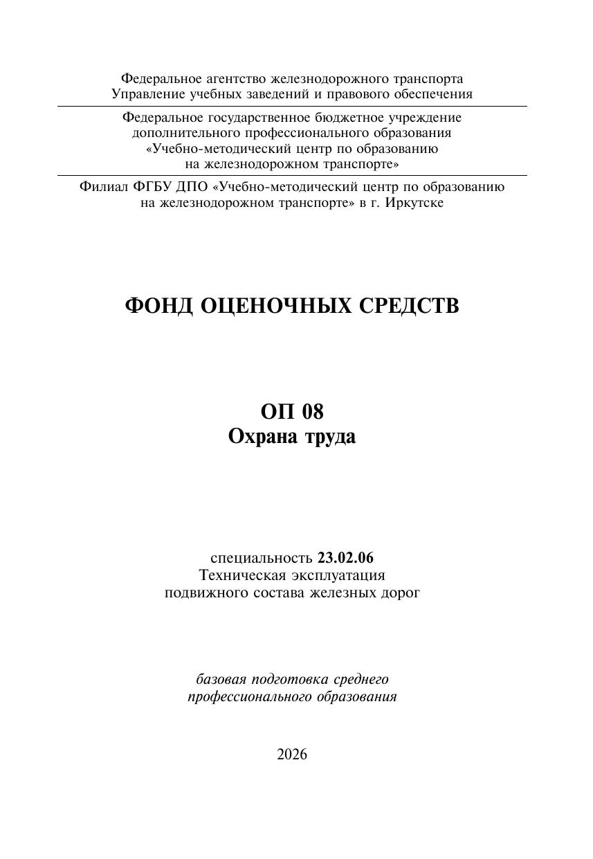 Целуйко, Д.И. Фонд оценочных средств ОП 08 Охрана труда : фонд оценочных средств / Д. И. Целуйко. — Москва : УМЦ ЖДТ, 2026. — 116 с. — Текст : электронный // УМЦ ЖДТ : электронная библиотека. — URL: https://umczdt.ru/books/1232/300738/ (дата обращения 17.04.2026). — Режим доступа: по подписке.