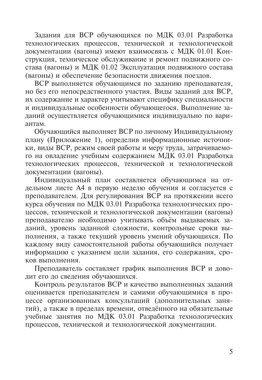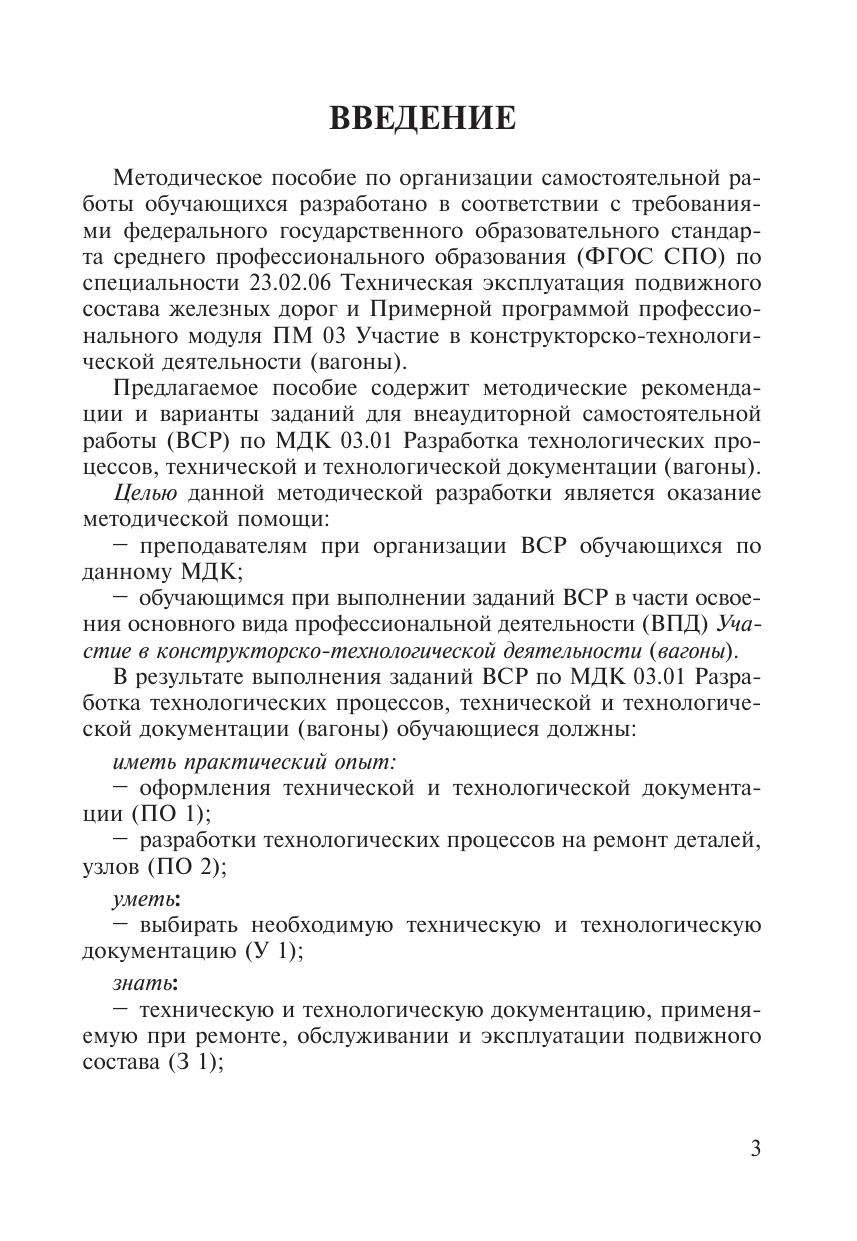 Предлагаемое пособие содержит методические рекомендации и варианты заданий для внеаудиторной самостоятельной работы (ВСР) по МДК 03.01 Разработка технологических процессов, технической и технологической документации (вагоны).
