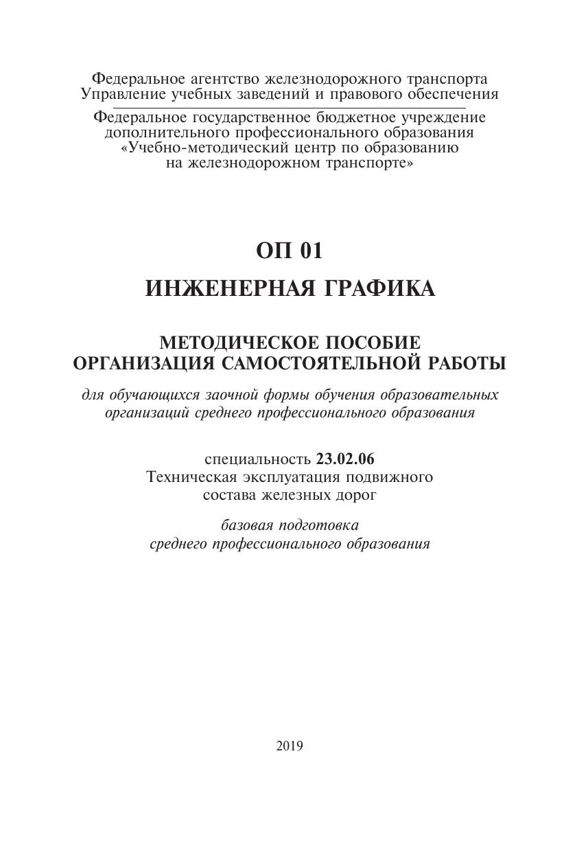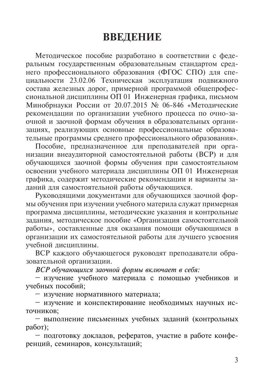 Методическое пособие разработано в соотвествии с федеральным государственным образовательным стандартом среднего профессионального образования (ФГОС СПО) для специальности 23.02.06 Техническая эксплуатация подвижного состава железных дорог, примерной программой общепрофессиональной дисциплины ОП 01 Инженерная графика, письмом Минобрнауки России от 20.07.2015 № 06-846 "Методические рекомендации по организации учебного процесса по очно-заочной формам обучения в образовательных организациях, реализуюхих основные профессиональные образовательные программы среднего профессионального образования