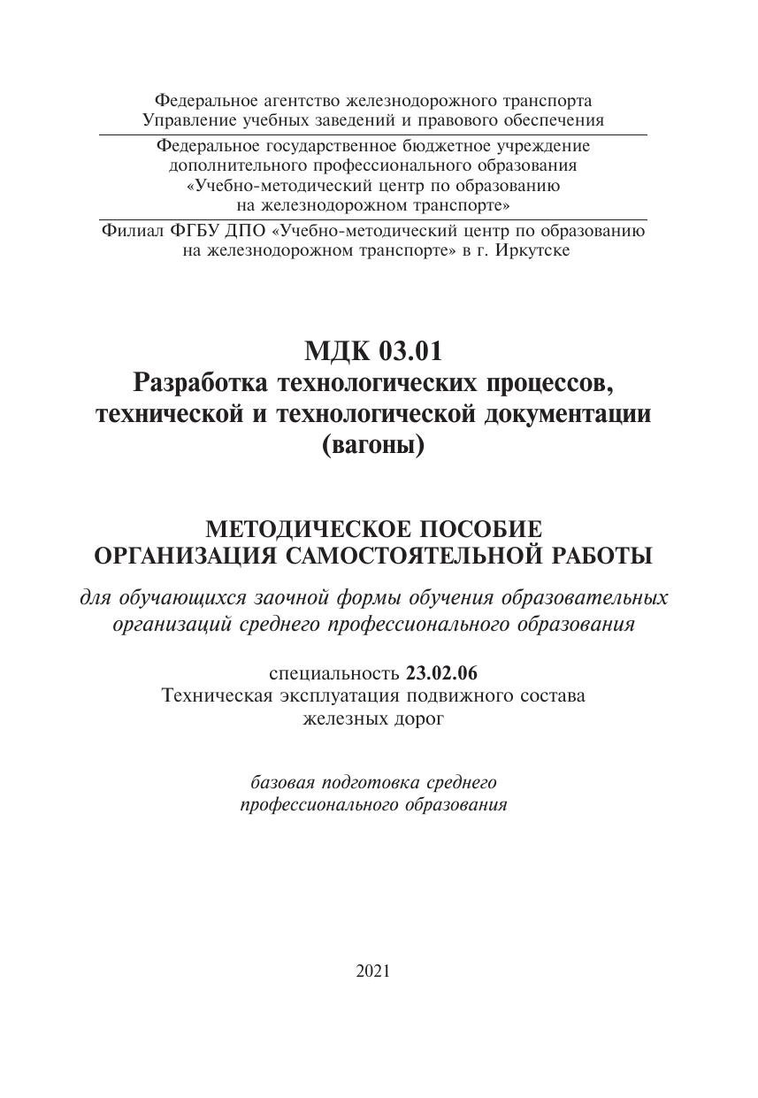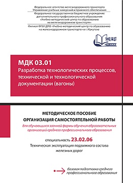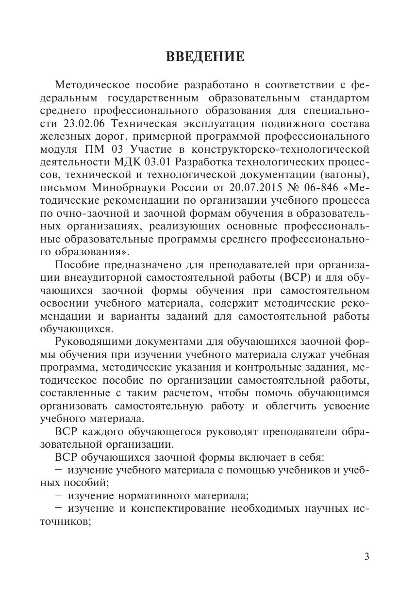Методическое пособие разработано в соответствии с ФГОС СПО  для специальности 23.02.06 Техническая эксплуатация подвижного состава железных дорог, примерной программой  ПМ 03 Участие в конструкторско-технологической деятельности МДК 03.01 Разработка технологических процессов, технической и технологической документации (вагоны), письмом Минобрнауки России от 20.07.2015 № 06-846 «Методические рекомендации по организации учебного процесса по очно-заочной и заочной формам обучения в образовательных организациях, реализующих основные профессиональные образовательные программы среднего профессионального образования». Пособие предназначено для преподавателей при организации внеаудиторной самостоятельной работы  и для обучающихся заочной формы обучения при самостоятельном освоении учебного материала, содержит методические рекомендации и варианты заданий для самостоятельной работы.
