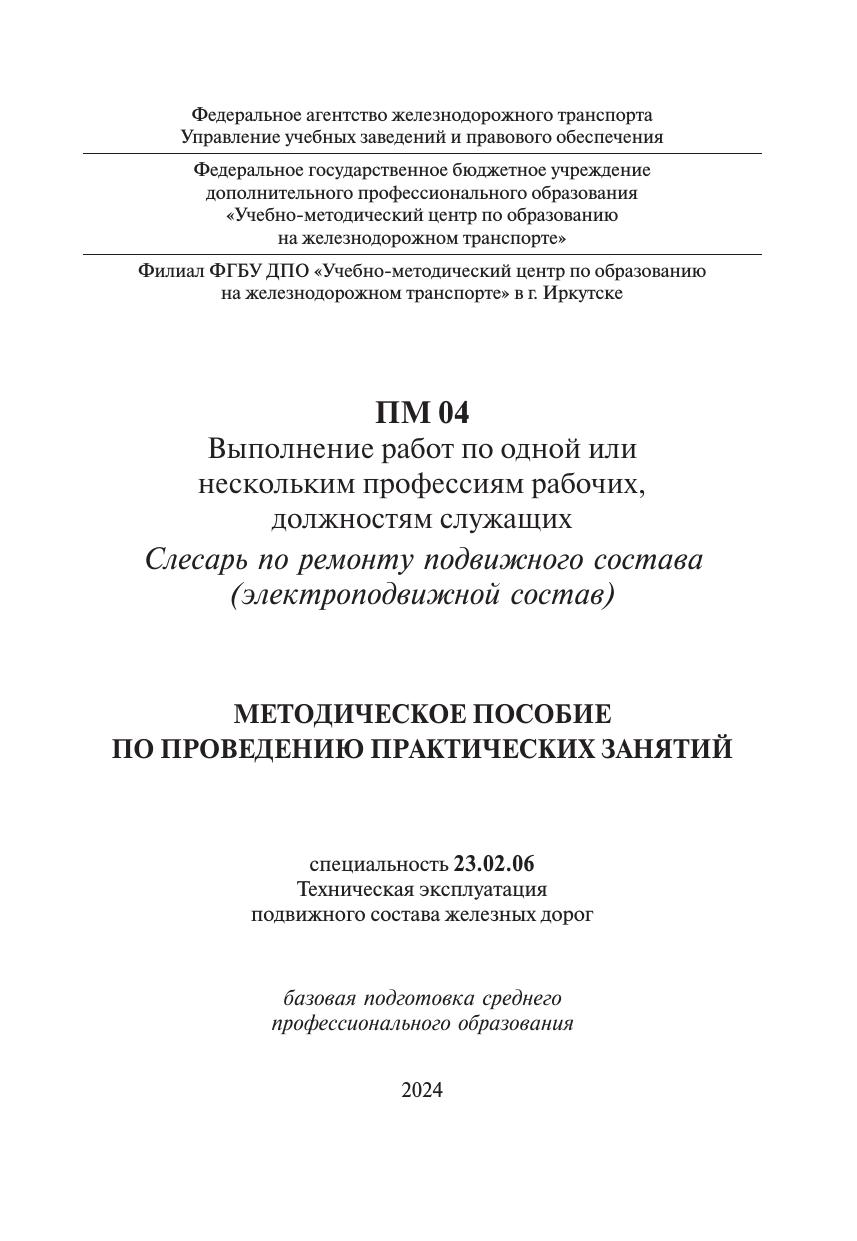 Методическое пособие по проведению практических занятий разработано в соответствии с ФГОС СПО по специальности 23.02.06 и ПП ПМ 04 Выполнение работ по одной или нескольким профессиям рабочих, должностям служащих "Слесарь по ремонту подвижного состава (электроподвижной состав)". Предназначено для обучающихся ОО СПО в качестве руководства при выполнении практических занятий, также может быть использовано в ДПО и профессиональной подготовке рабочих.