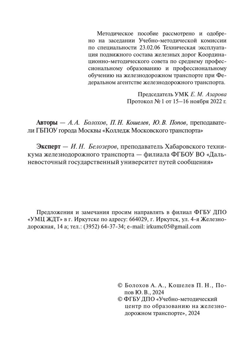 Попов, Ю.В. Методическое пособие по проведению практических занятий ПМ 04 Выполнение работ по одной или нескольким профессиям рабочих, должностям служащих Слесарь по ремонту подвижного состава (электроподвижной состав) : учебное пособие / А. А. Болохов, П. Н. Кошелев, Ю. В. Попов. — Москва : УМЦ ЖДТ, 2024. — 141 с. — Текст : электронный // УМЦ ЖДТ : электронная библиотека. — URL: https://umczdt.ru/books/1233/288412/ (дата обращения 14.12.2025). — Режим доступа: по подписке.