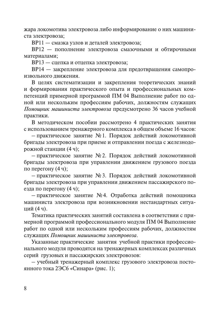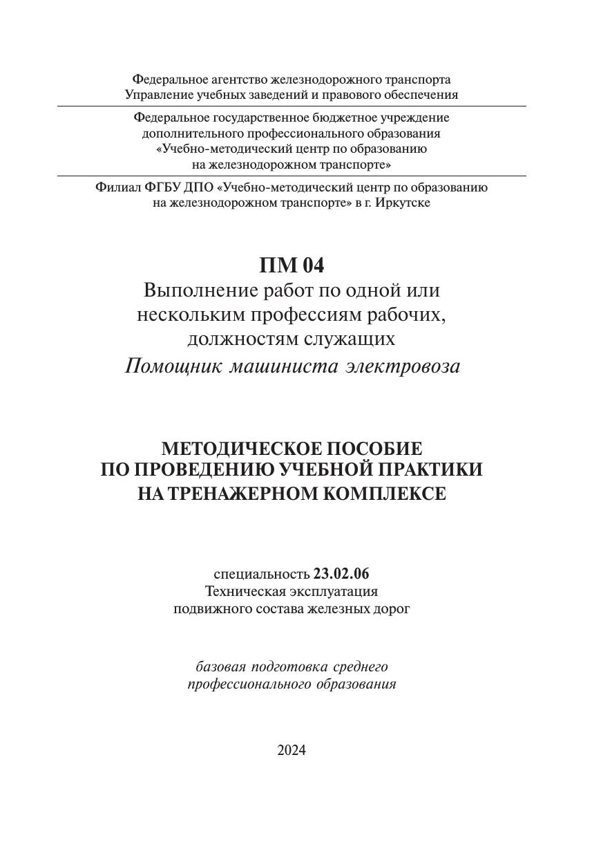 Методическое пособие разработано в соответствии с ФГОС СПО и ПП ПМ 04 Выполнение работ по одной или нескольким профессиям рабочих, должностям служащих "Помощник машиниста электровоза". Предназначено обучающимся ОО СПО в качестве руководства при выполнении ПЗ учебной практики на тренажерном комплексе, а также преподавателям для организации учебного процесса. Может быть использовано в ДПО  и профессиональной подготовке рабочих по данной профессии.