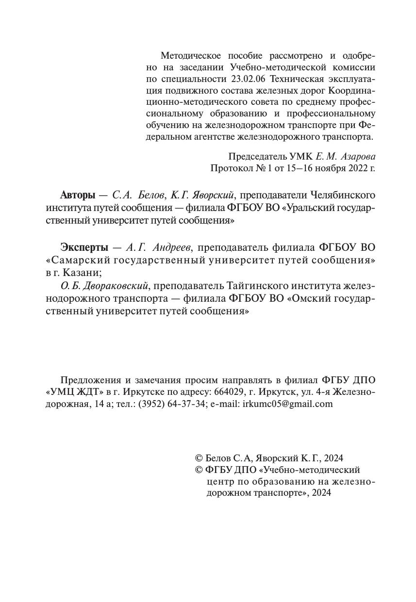Яворский, К.Г. Методическое пособие по проведению учебной практики на тренажерном комплексе ПМ 04 Выполнение работ по одной или нескольким профессиям рабочих, должностям служащих Помощник машиниста электровоза : учебное пособие / С. А. Белов, К. Г. Яворский. — Москва : УМЦ ЖДТ, 2024. — 92 с. — Текст : электронный // УМЦ ЖДТ : электронная библиотека. — URL: https://umczdt.ru/books/1233/288419/ (дата обращения 14.12.2025). — Режим доступа: по подписке.