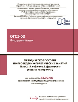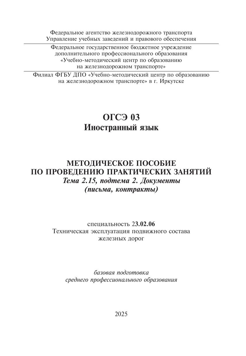 Зырянова, Е.Л. Методическое пособие по проведению практических занятий по дисциплине ОГСЭ 03 Иностранный язык. Тема 2.15, подтема 2. Документы (письма, контракты) : методическое пособие / Е. Л. Зырянова. — Москва : УМЦ ЖДТ, 2025. — 32 с. — Текст : электронный // УМЦ ЖДТ : электронная библиотека. — URL: https://umczdt.ru/books/1233/296523/ (дата обращения 21.01.2026). — Режим доступа: по подписке.