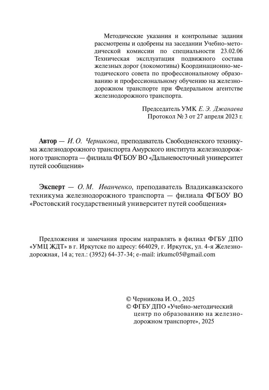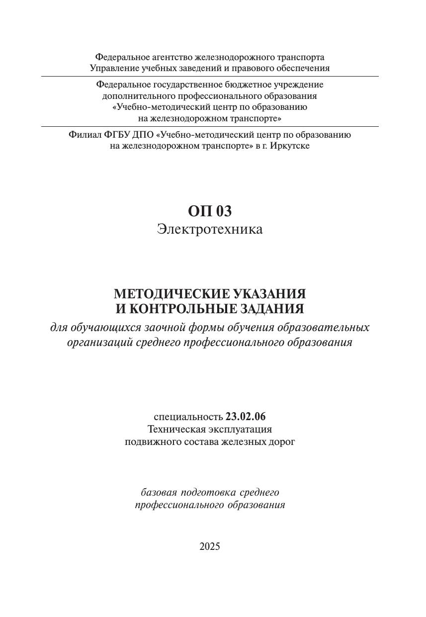 Черникова, И.О. Методические указания и контрольные задания для обучающихся заочной формы обучения образовательных организаций среднего профессионального образования ОП 03 Электротехника : методическое пособие / И. О. Черникова. — Москва : УМЦ ЖДТ, 2025. — 88 с. — Текст : электронный // УМЦ ЖДТ : электронная библиотека. — URL: https://umczdt.ru/books/1233/296525/ (дата обращения 08.11.2025). — Режим доступа: по подписке.