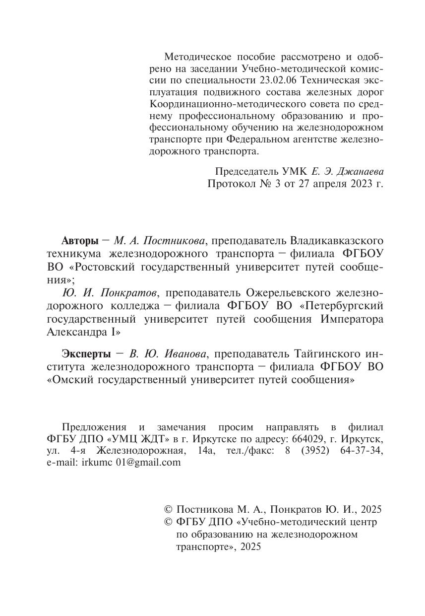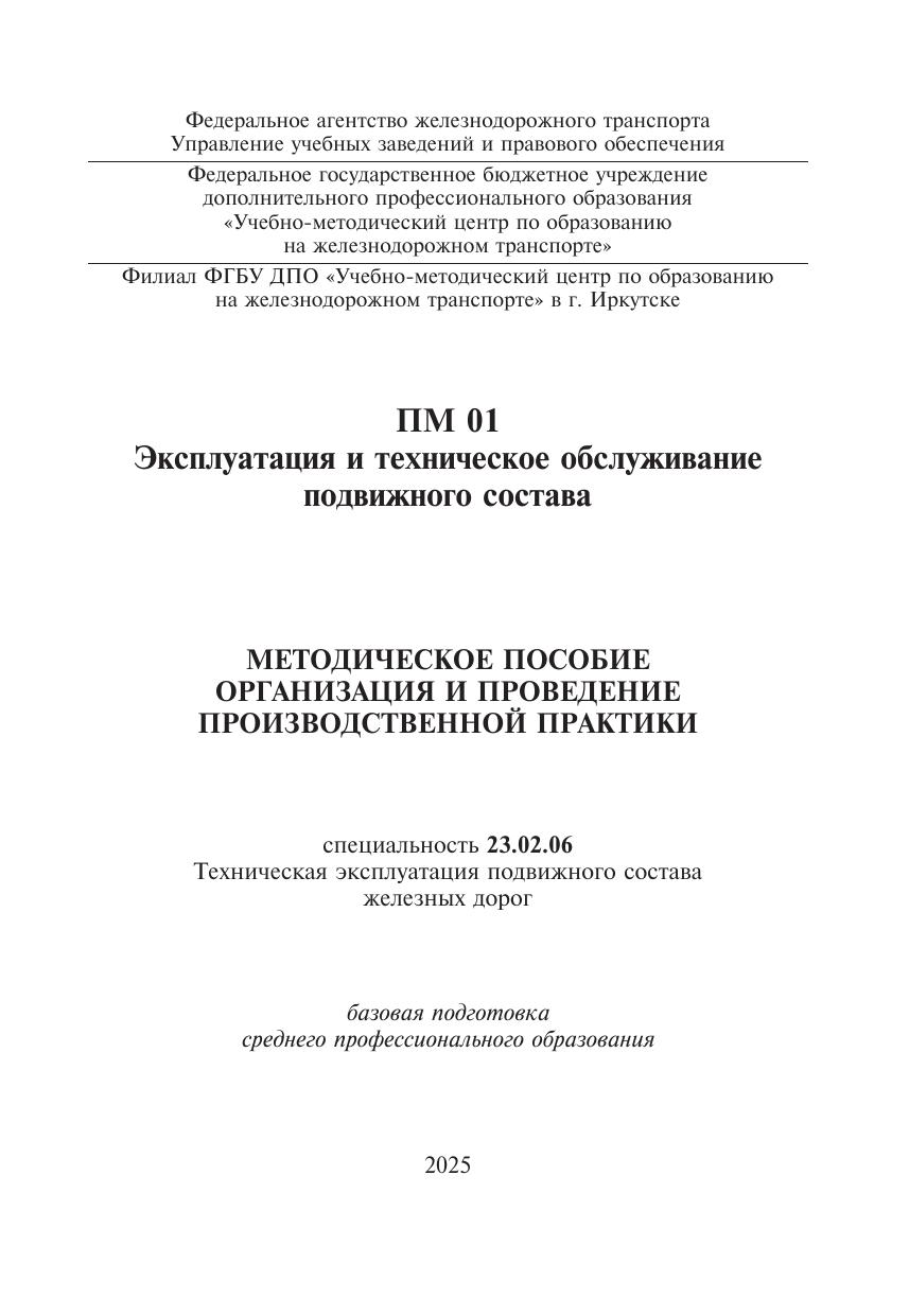 Понкратов, Ю.И. Методическое пособие Организация и проведение производственной практики ПМ 01 Эксплуатация и техническое обслуживание подвижного состава : методическое пособие / М. А. Постникова, Ю. И. Понкратов. — Москва : УМЦ ЖДТ, 2025. — 68 с. — Текст : электронный // УМЦ ЖДТ : электронная библиотека. — URL: https://umczdt.ru/books/1233/296527/ (дата обращения 09.11.2025). — Режим доступа: по подписке.
