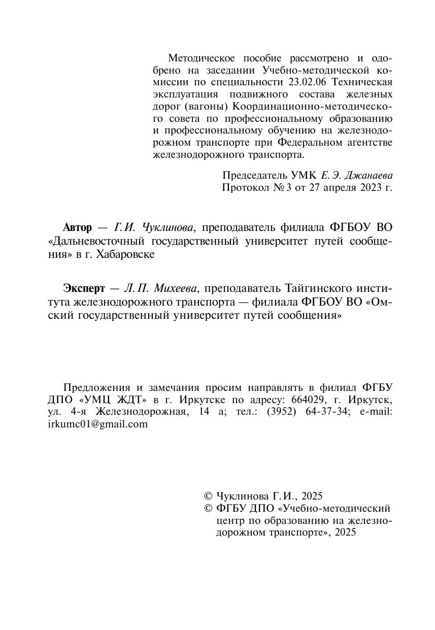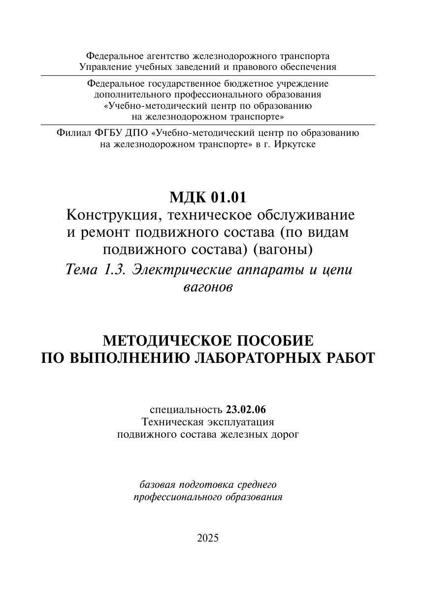 Чуклинова, Г.И. Методическое пособие по выполнению лабораторных работ МДК 01.01 Конструкция, техническое обслуживание и ремонт подвижного состава (по видам подвижного состава) (вагоны) Тема 1.3. Электрические аппараты и цепи вагонов : методическое пособие / Г. И. Чуклинова. — Москва : УМЦ ЖДТ, 2025. — 44 с. — Текст : электронный // УМЦ ЖДТ : электронная библиотека. — URL: https://umczdt.ru/books/1233/296528/ (дата обращения 08.11.2025). — Режим доступа: по подписке.