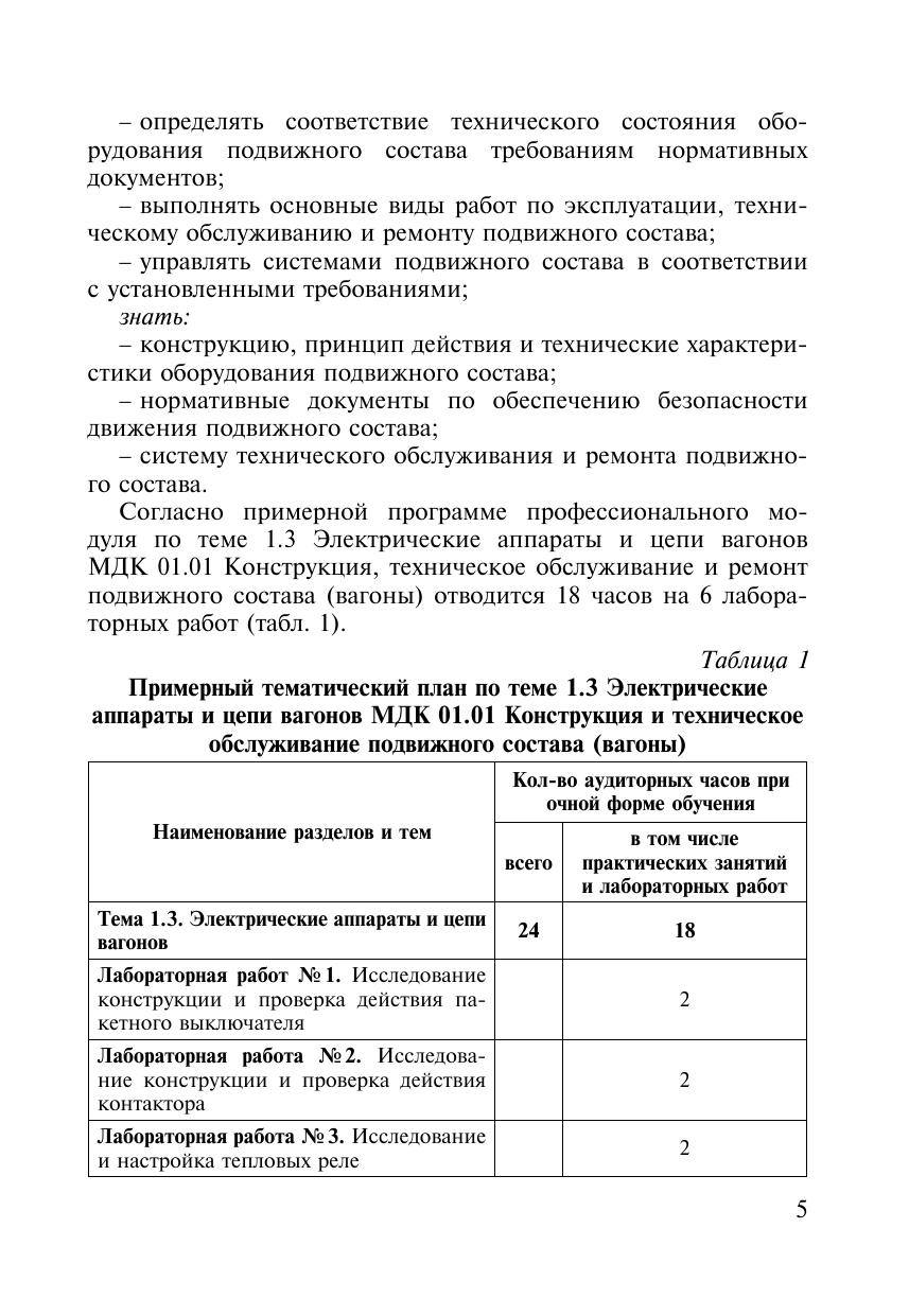 Методическое пособие разработано в соответствии с ФГОС СПО по специальности 23.02.06 и ПП ПМ 01 Эксплуатация и техническое обслуживание подвижного состава (вагоны). Является руководством по проведению лабораторных работ МДК 01.01 Конструкция и техническое обслуживание подвижного состава (вагоны) по теме 1.3 Электрические аппараты и цепи вагонов.
