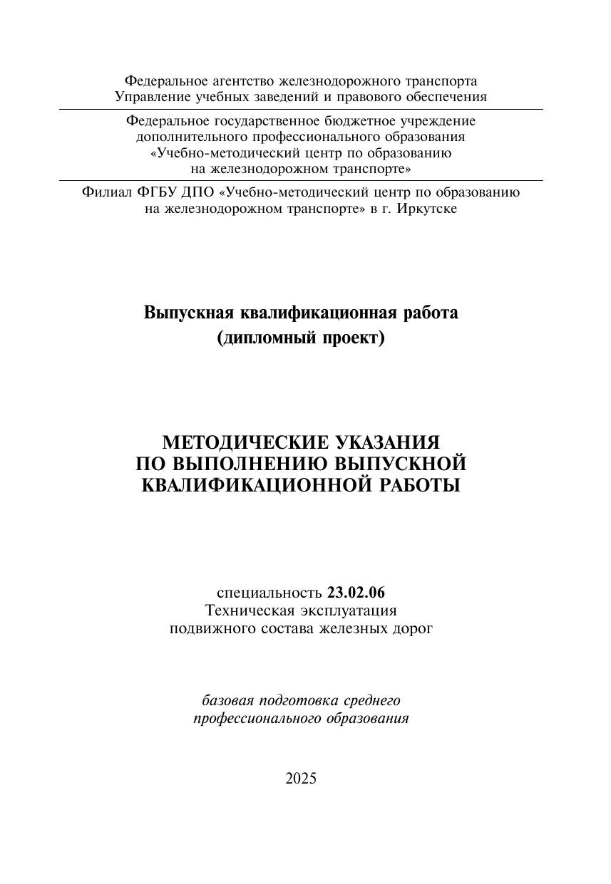 Методические указания разработаны в соответствии с ФГОС СПО по специальности 23.02.06 Техническая эксплуатация подвижного состава железных дорог и Порядком проведения ГИА по образовательным программам СПО. Предназначены  для оказания помощи преподавателям и обучающимся при разработке ВКР. Содержат порядок подготовки, требования к структуре и содержанию, методические указания по выполнению и защите, перечень рекомендуемых источников.