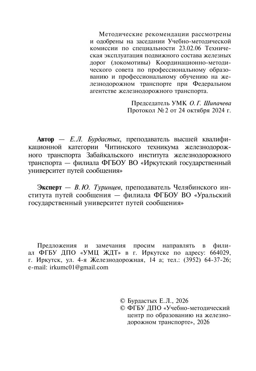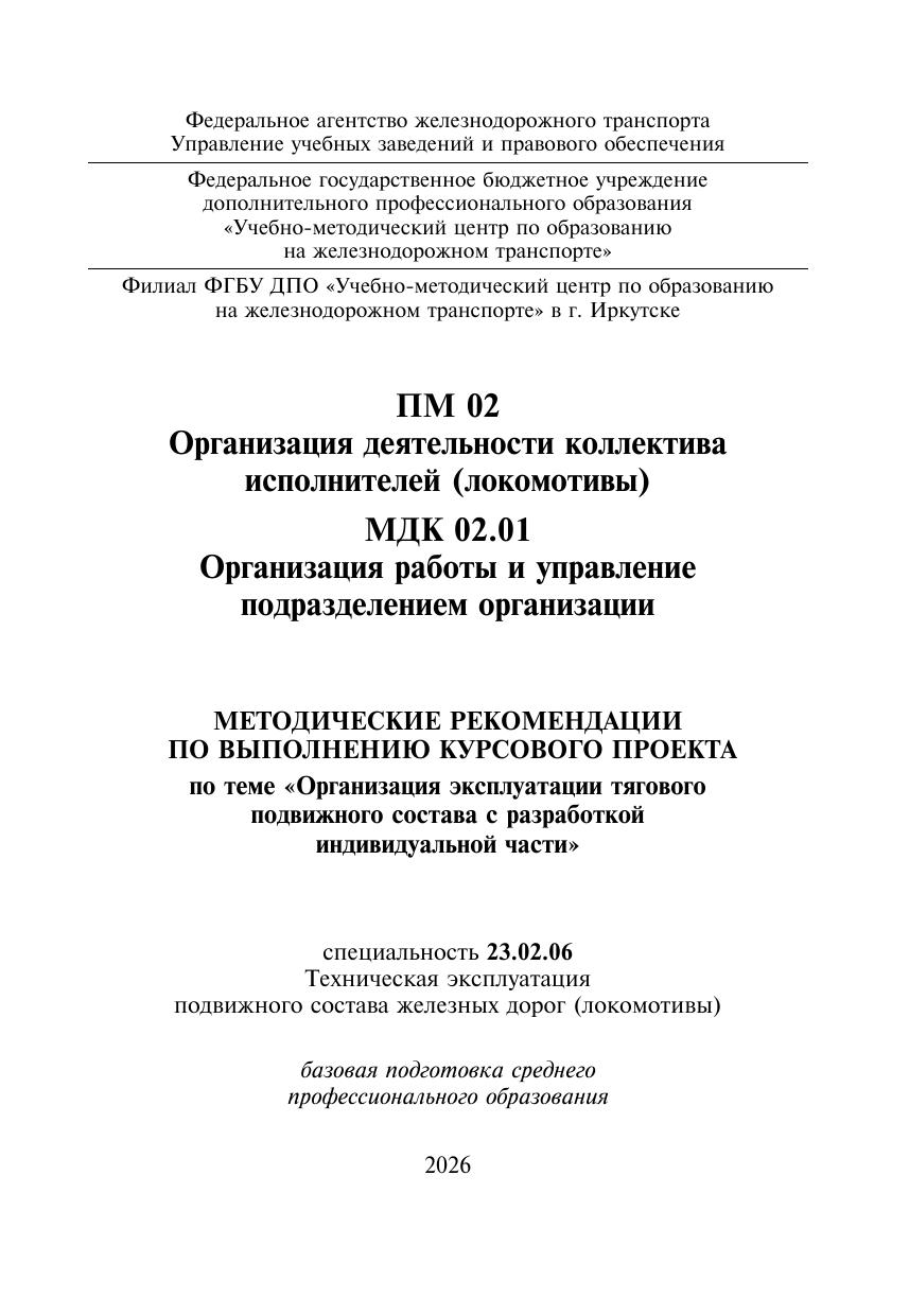 Бурдастых, Е.Л. Методические рекомендации по выполнению курсового проекта по теме «Организация эксплуатации тягового подвижного состава с разработкой индивидуальной части» ПМ 02 Организация деятельности коллектива исполнителей (локомотивы) МДК 02.01 Организация работы и : методическое пособие / Е. Л. Бурдастых. — Москва : УМЦ ЖДТ, 2026. — 60 с. — Текст : электронный // УМЦ ЖДТ : электронная библиотека. — URL: https://umczdt.ru/books/1233/300731/ (дата обращения 17.04.2026). — Режим доступа: по подписке.