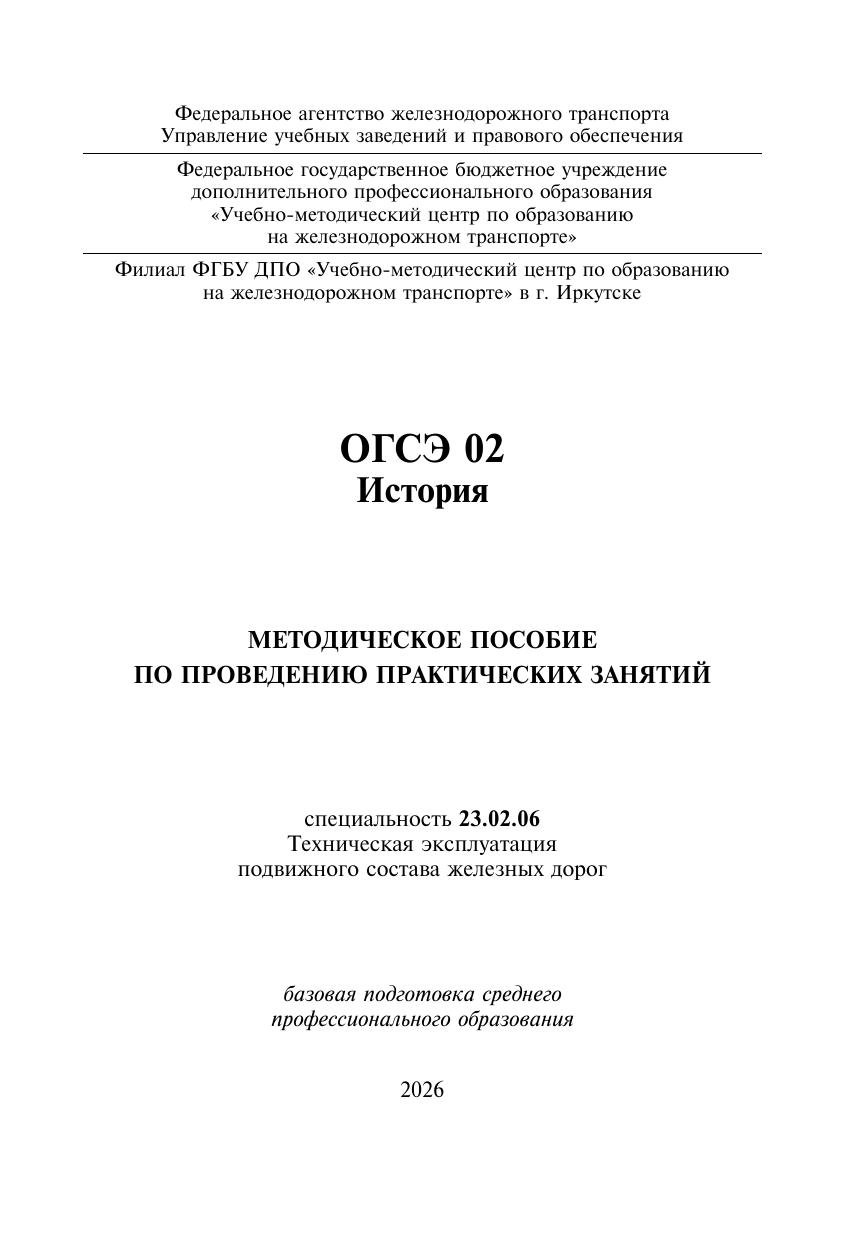 Банных, Н.А. Методическое пособие по проведению практических занятий ОГСЭ 02 История : методическое пособие / Н. А. Банных. — Москва : УМЦ ЖДТ, 2026. — 68 с. — Текст : электронный // УМЦ ЖДТ : электронная библиотека. — URL: https://umczdt.ru/books/1233/300735/ (дата обращения 17.04.2026). — Режим доступа: по подписке.