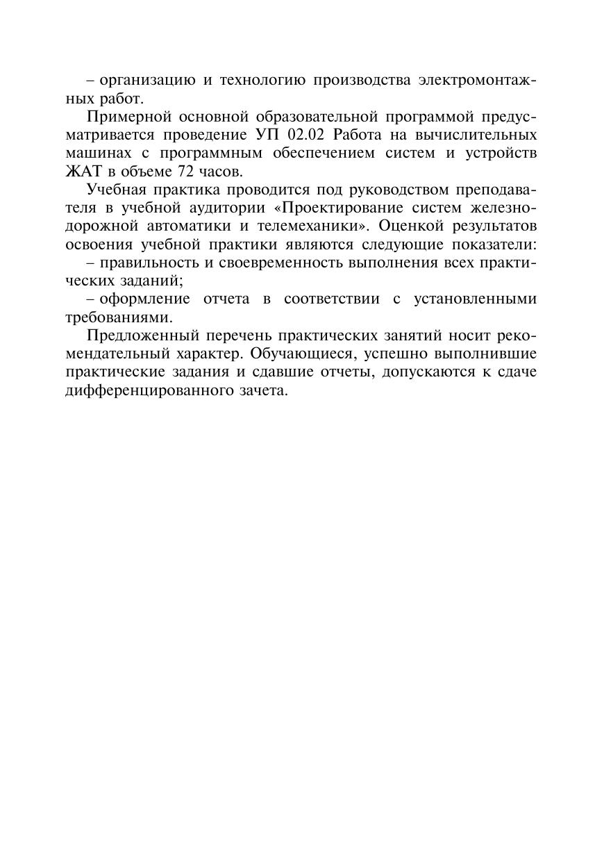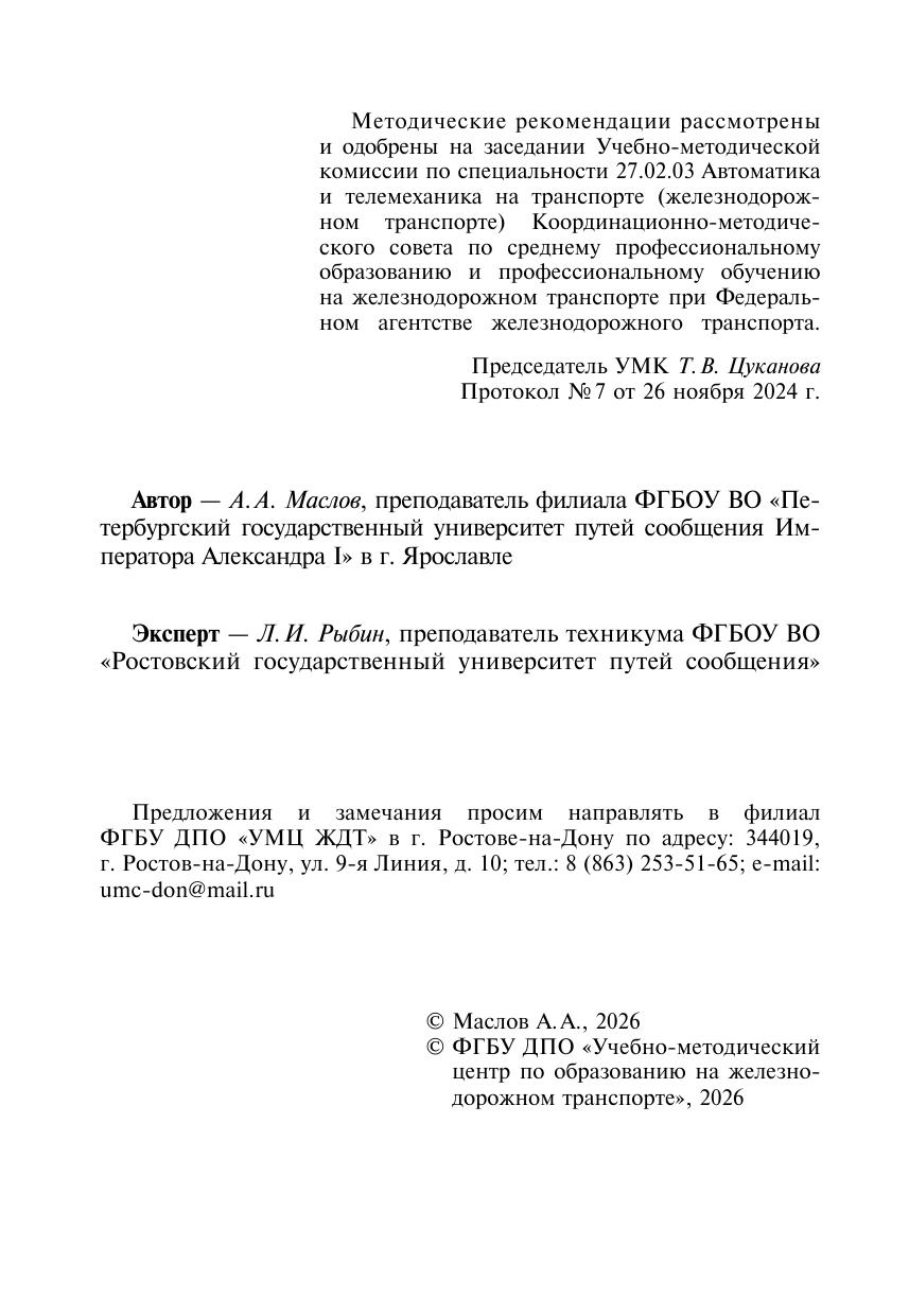 Маслов, А.А. Методические рекомендации по проведению практических занятий учебной практики «Работа на вычислительных машинах с программным обеспечением систем и устройств ЖАТ» ПМ 02 Техническое обслуживание устройств систем сигнализации, централизации и блокировки, же : методическое пособие / А. А. Маслов. — Москва : УМЦ ЖДТ, 2026. — 80 с. — Текст : электронный // УМЦ ЖДТ : электронная библиотека. — URL: https://umczdt.ru/books/1236/300682/ (дата обращения 01.05.2026). — Режим доступа: по подписке.