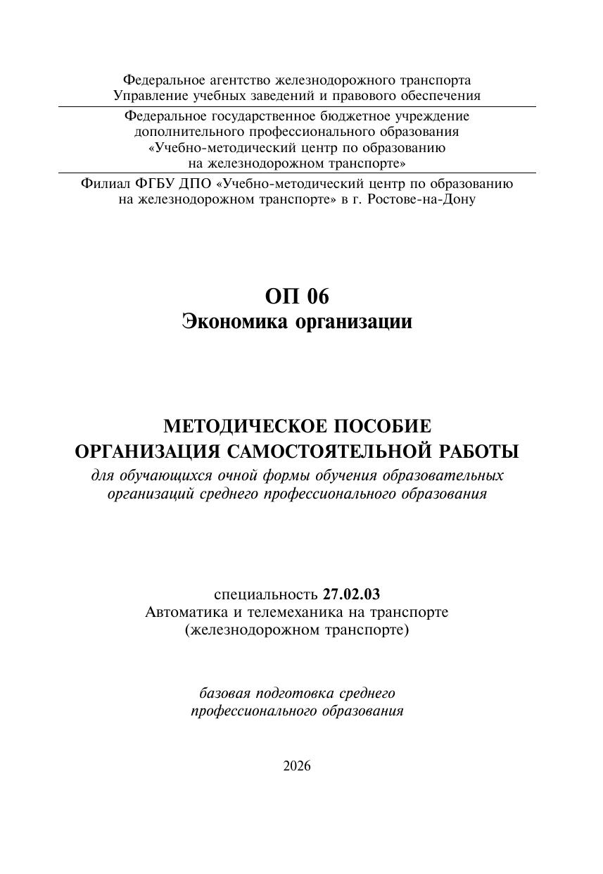 Лагерева, С.В. Методическое пособие Организация самостоятельной работы для обучающихся очной формы обучения образовательных организаций среднего профессионального образования ОП 06 Экономика организации : методическое пособие / С. В. Лагерева. — Москва : УМЦ ЖДТ, 2026. — 72 с. — Текст : электронный // УМЦ ЖДТ : электронная библиотека. — URL: https://umczdt.ru/books/1236/300687/ (дата обращения 01.05.2026). — Режим доступа: по подписке.