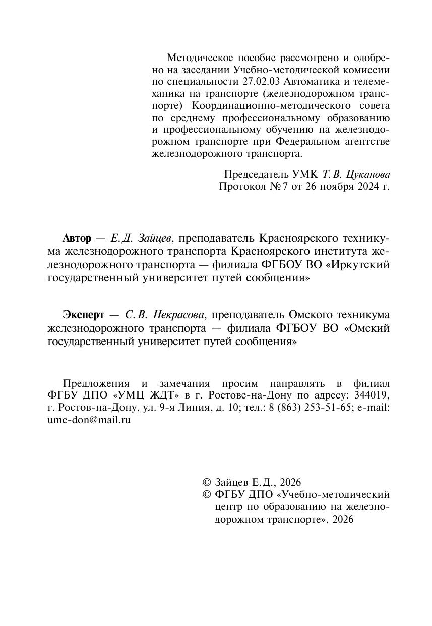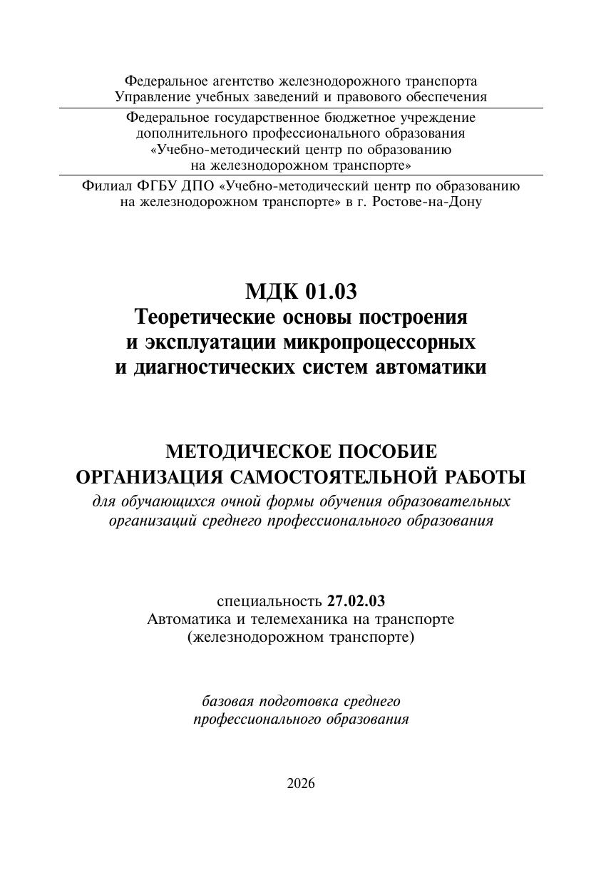 Зайцев, Е.Д. Методическое пособие Организация самостоятельной работы для обучающихся очной формы обучения образовательных организаций среднего профессионального образования МДК 01.03 Теоретические основы построения и эксплуатации микропроцессорных и диагностических си : методическое пособие / Е. Д. Зайцев. — Москва : УМЦ ЖДТ, 2026. — 36 с. — Текст : электронный // УМЦ ЖДТ : электронная библиотека. — URL: https://umczdt.ru/books/1236/300688/ (дата обращения 01.05.2026). — Режим доступа: по подписке.