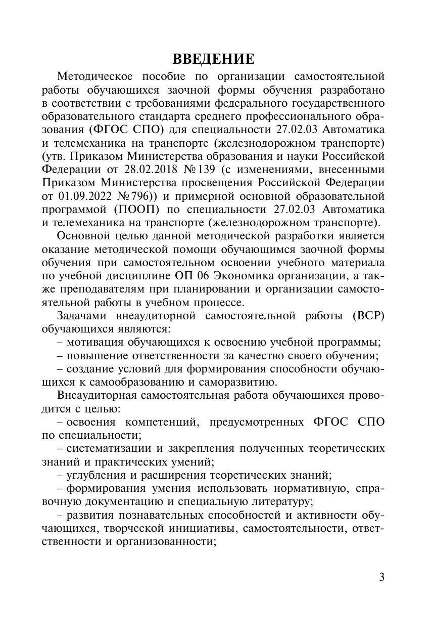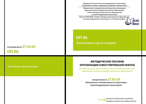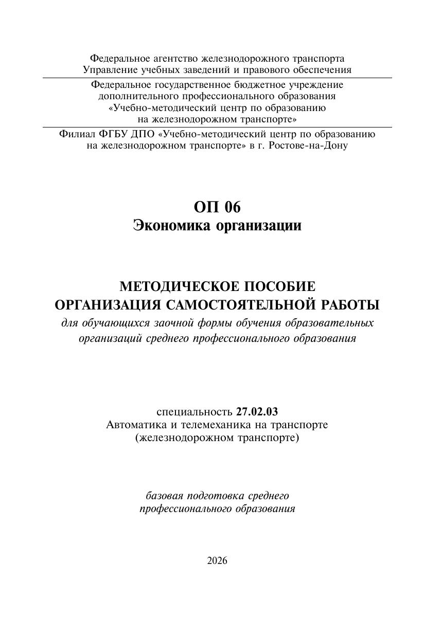 Стрельцова, И.В. Методическое пособие Организация самостоятельной работы для обучающихся заочной формы обучения образовательных организаций среднего профессионального образования ОП 06 Экономика организации : методическое пособие / И. В. Стрельцова. — Москва : УМЦ ЖДТ, 2026. — 108 с. — Текст : электронный // УМЦ ЖДТ : электронная библиотека. — URL: https://umczdt.ru/books/1236/300689/ (дата обращения 30.04.2026). — Режим доступа: по подписке.