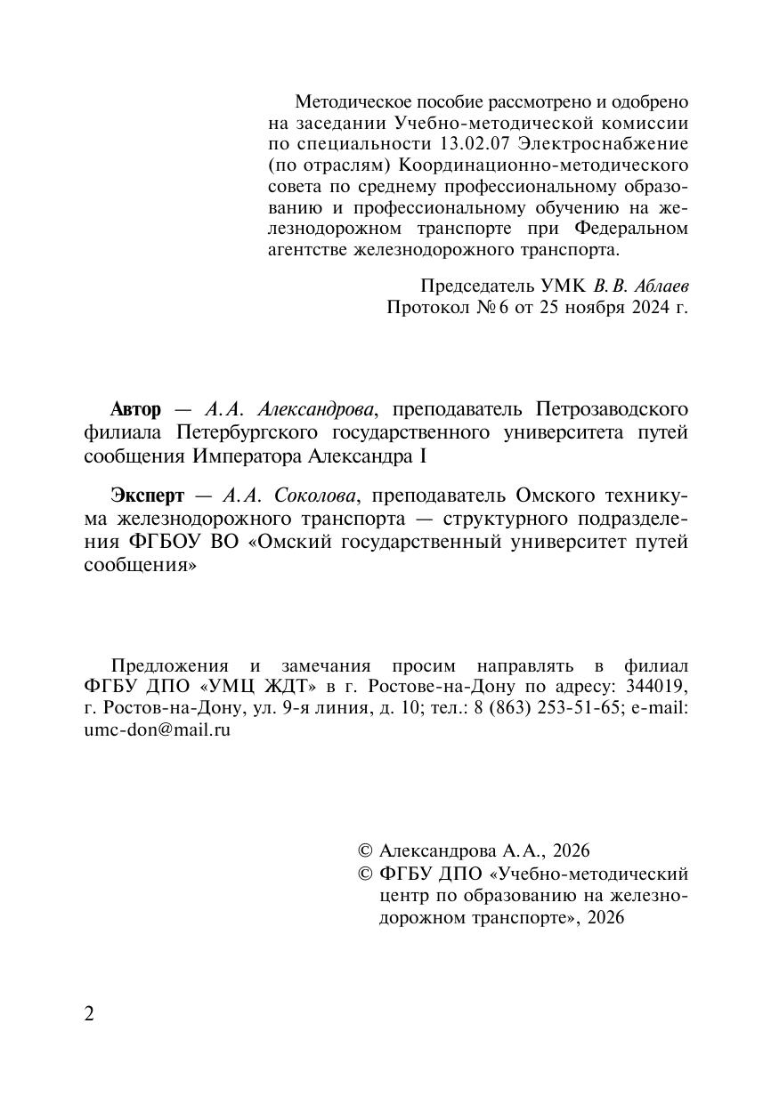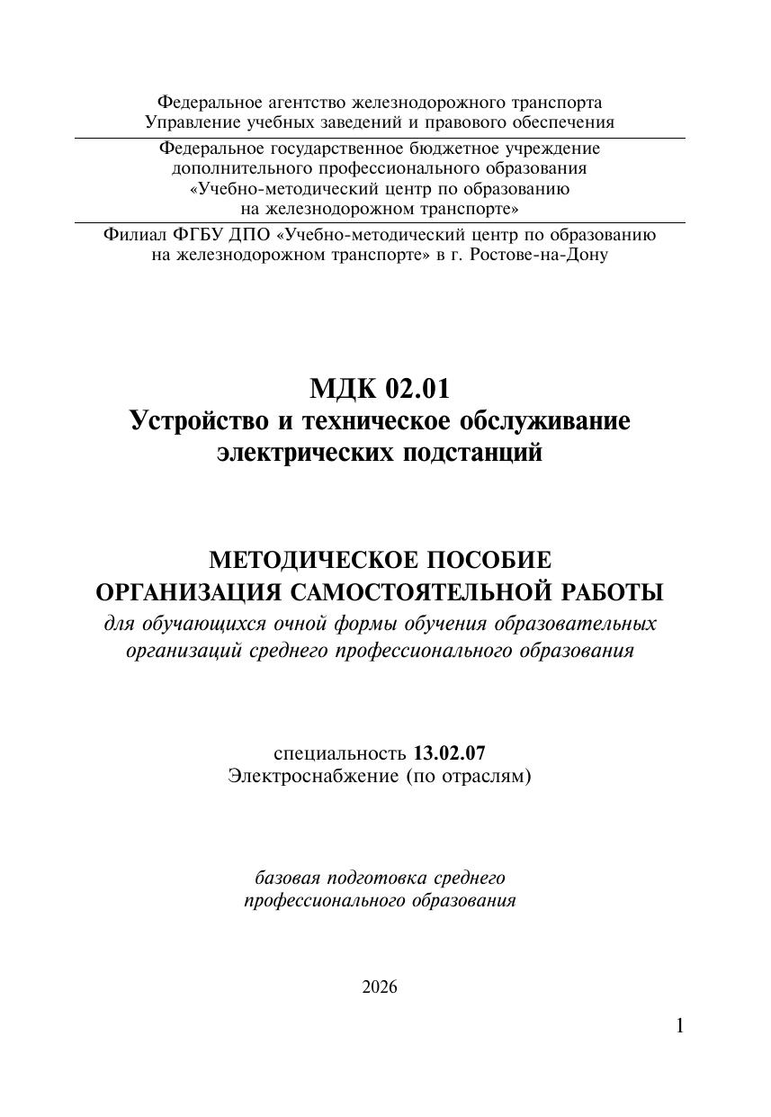 Александрова, А.А. Методическое пособие Организация самостоятельной работы для обучающихся очной формы обучения образовательных организаций среднего профессионального образования МДК 02.01 Устройство и техническое обслуживание электрических подстанций : методическое пособие / А. А. Александрова. — Москва : УМЦ ЖДТ, 2026. — 52 с. — Текст : электронный // УМЦ ЖДТ : электронная библиотека. — URL: https://umczdt.ru/books/1239/300672/ (дата обращения 17.04.2026). — Режим доступа: по подписке.