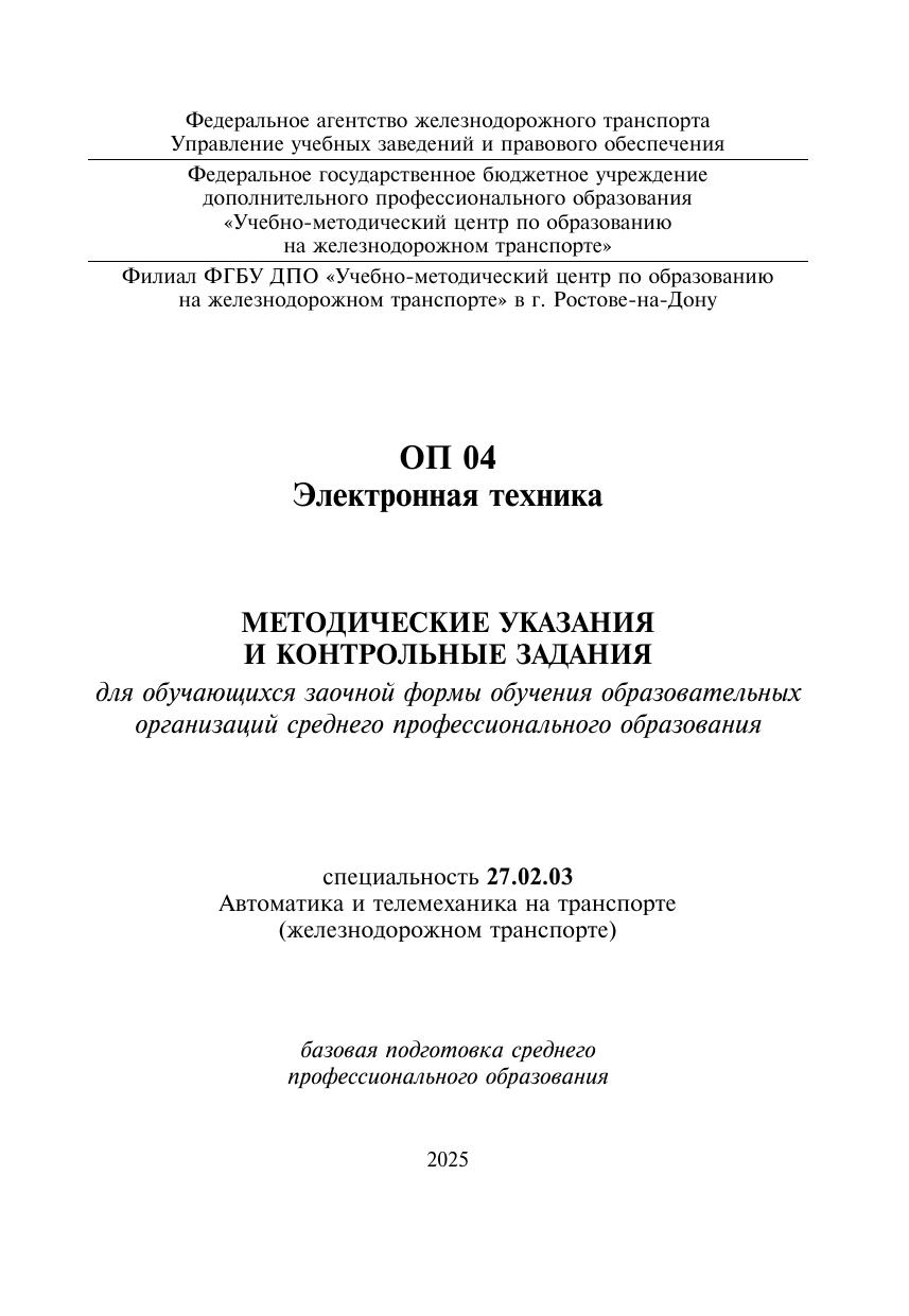 Пешина, Л.В. Методические указания и контрольные задания для обучающихся заочной формы обучения образовательных организаций среднего профессионального образования ОП 04 Электронная техника : методическое пособие / Л. В. Пешина. — Москва : УМЦ ЖДТ, 2025. — 48 с. — Текст : электронный // УМЦ ЖДТ : электронная библиотека. — URL: https://umczdt.ru/books/1242/296582/ (дата обращения 30.04.2026). — Режим доступа: по подписке.