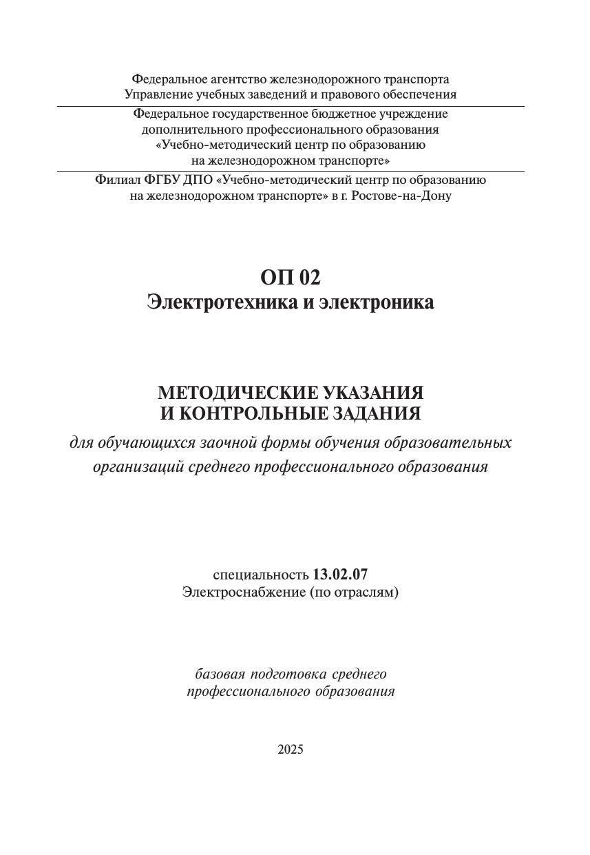 Жирнова, В.М. Методические указания и контрольные задания для обучающихся заочной формы обучения образовательных организаций среднего профессионального образования ОП 02 Электротехника и электроника : методическое пособие / В. М. Жирнова. — Москва : УМЦ ЖДТ, 2025. — 116 с. — Текст : электронный // УМЦ ЖДТ : электронная библиотека. — URL: https://umczdt.ru/books/1248/296579/ (дата обращения 14.02.2026). — Режим доступа: по подписке.