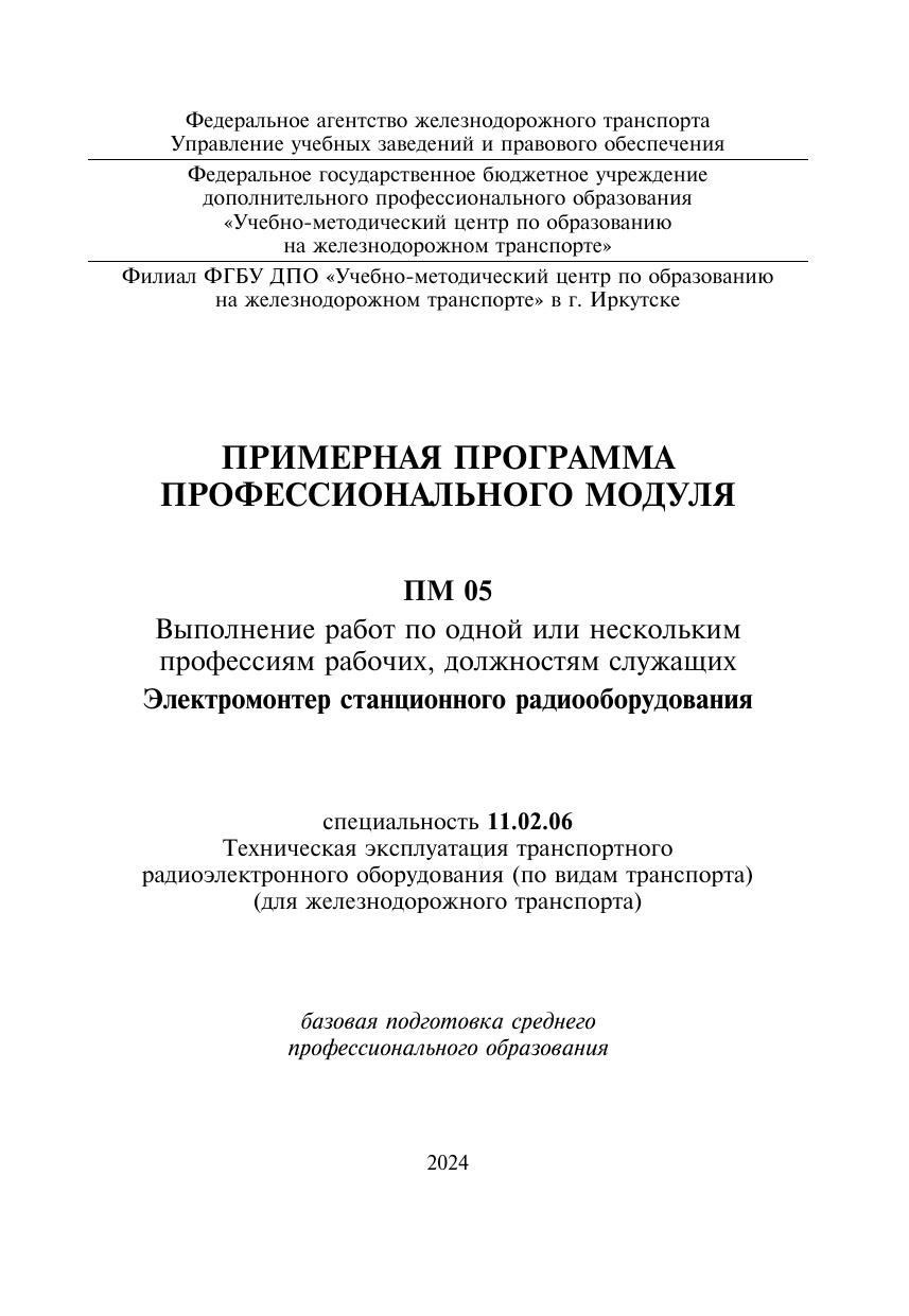 Кабанова, А.А. Примерная программа профессионального модуля ПМ 05 Выполнение работ по одной или нескольким профессиям рабочих, должностям служащих Электромонтер станционного радиооборудования : фонд оценочных средств / А. А. Кабанова. — Москва : УМЦ ЖДТ, 2024. — 32 с. — Текст : электронный // УМЦ ЖДТ : электронная библиотека. — URL: https://umczdt.ru/books/1251/288434/ (дата обращения 29.04.2026). — Режим доступа: по подписке.