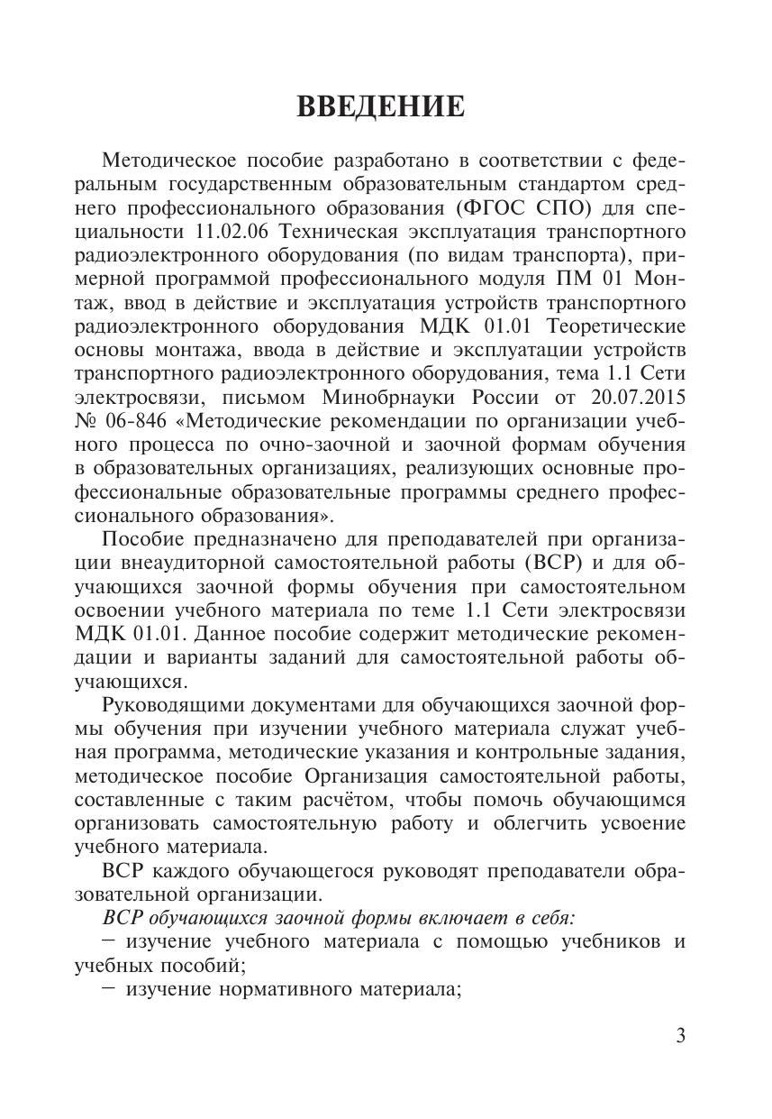 Пособие предназначено для преподавателей при организации внеаудиторной самостоятельной работы (ВСР) и для обучающихся заочной формы обучения при самостоятельном освоении учебного материала по теме 1.1 Сети электросвязи МДК 01.01. Данное пособие содержит методические рекомендации и варианты заданий для самостоятельной работы об-учающихся.