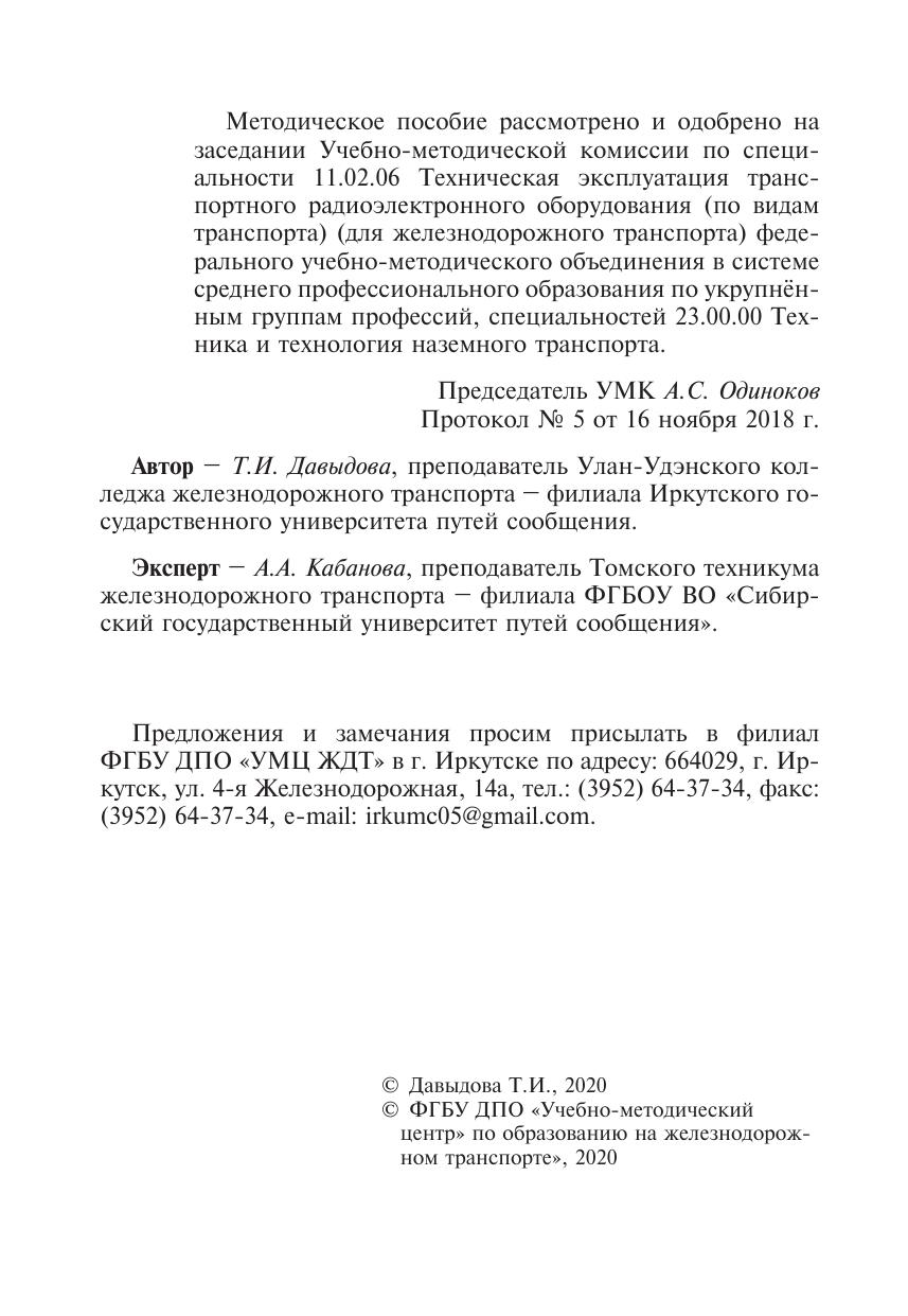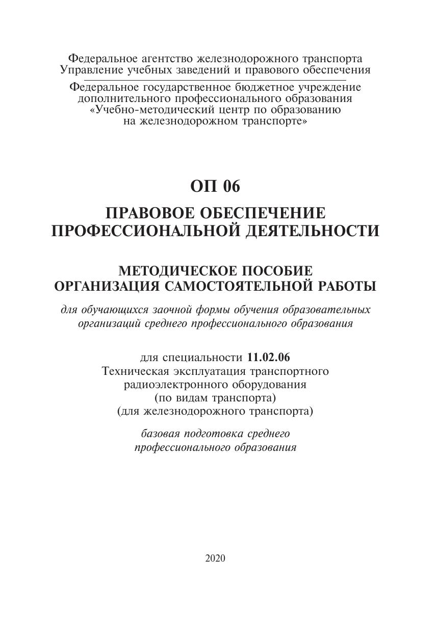 Давыдова, Т.И. Методическое пособие Организация самостоятельной работы для обучающихся заочной формы обучения образовательных организаций среднего профессионального образования ОП 06 Правовое обеспечение профессиональной деятельности : методическое пособие / Т. И. Давыдова. — Москва : ФГБУ ДПО «Учебно методический центр по образованию на железнодорожном транспорте», 2020. — 88 с. — Текст : электронный // УМЦ ЖДТ : электронная библиотека. — URL: https://umczdt.ru/books/1251/239705/ (дата обращения 16.04.2026). — Режим доступа: по подписке.