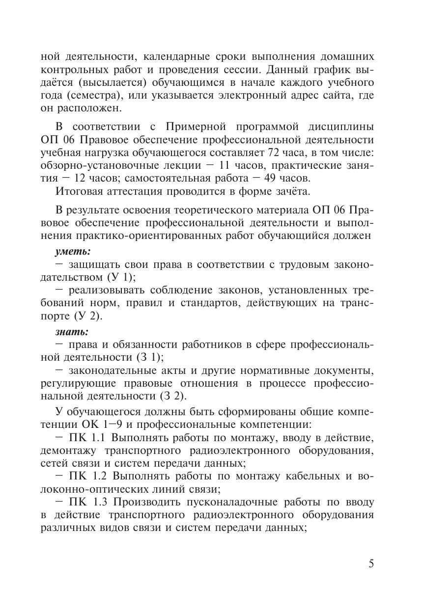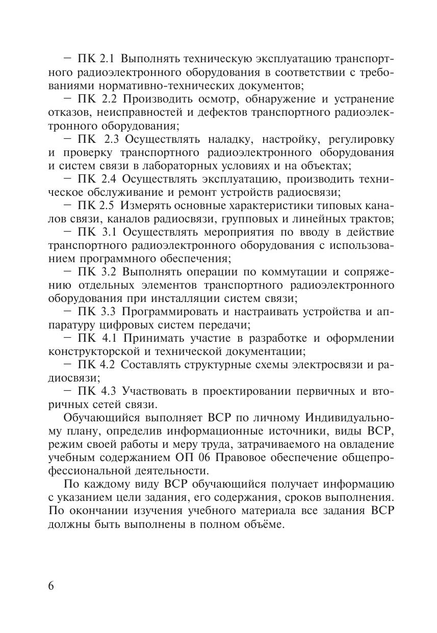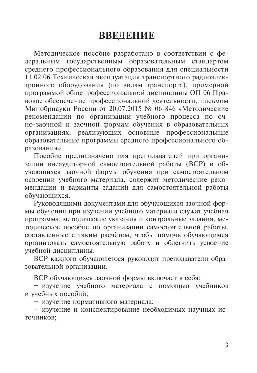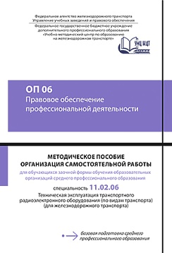 Методическое пособие разработано в соответствии с ФГОС  СПО для специальности 11.02.06 Техническая эксплуатация транспортного радиоэлектронного оборудования (по видам транспорта), примерной программой общепрофессиональной дисциплины ОП 06 Правовое обеспечение профессиональной деятельности, письмом Минобрнауки России от 20.07.2015 № 06-846 «Методические рекомендации по организации учебного процесса по очно-заочной и заочной формам обучения в образовательных организациях, реализующих основные профессиональные образовательные программы среднего профессионального образования». Пособие предназначено для преподавателей при организации внеаудиторной самостоятельной работы  и обучающихся заочной формы обучения при самостоятельном освоении учебного материала, содержит методические рекомендации и варианты заданий для самостоятельной работы.