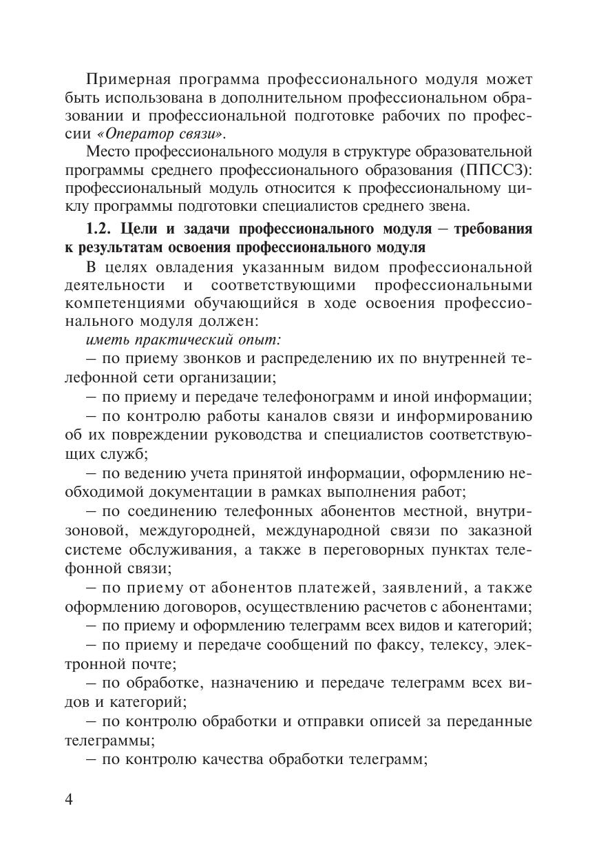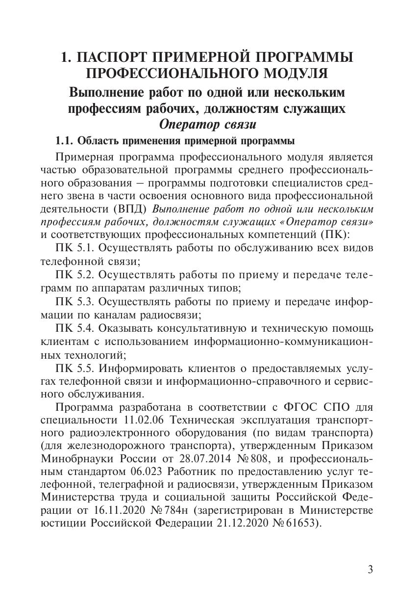 Примерная программа профессионального модуля разработана в соответствии с ФГОС СПО для специальности 11.02.06 Техническая эксплуатация транспортного радиоэлектронного оборудования и ПС 06.023 Работник по предоставлению услуг телефонной, телеграфной и радиосвязи. Программа может быть использована в ДПО и подготовке рабочих по профессии «Оператор связи».