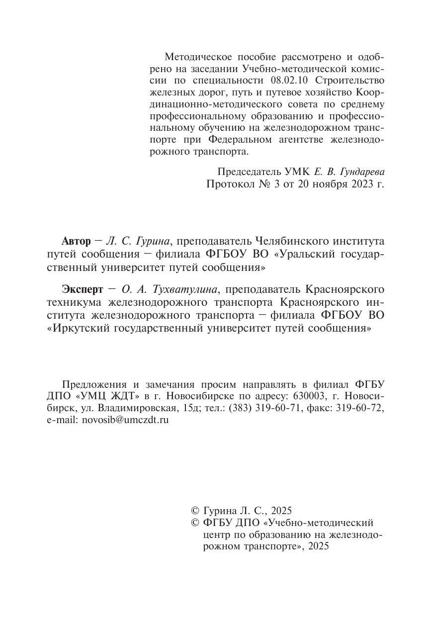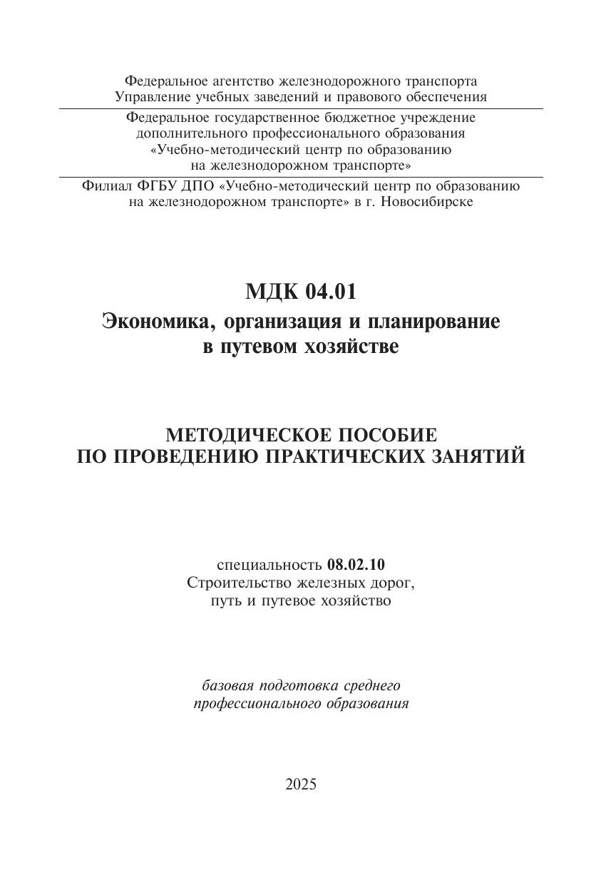 Гурина, Л.С. Методическое пособие по проведению практических занятий МДК 04.01 Экономика, организация и планирование в путевом хозяйстве : методическое пособие / Л. С. Гурина. — Москва : УМЦ ЖДТ, 2025. — 80 с. — Текст : электронный // УМЦ ЖДТ : электронная библиотека. — URL: https://umczdt.ru/books/1257/296567/ (дата обращения 13.03.2026). — Режим доступа: по подписке.