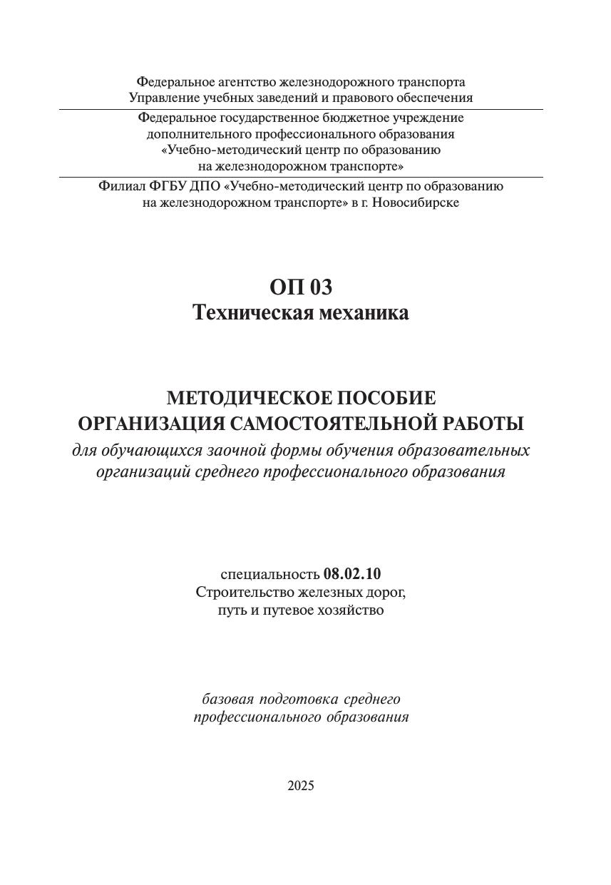 Джусупова, А.Г. Методическое пособие Организация самостоятельной работы для обучающихся заочной формы обучения образовательных организаций среднего профессионального образования ОП 03 Техническая механика : методическое пособие / А. Г. Джусупова. — Москва : УМЦ ЖДТ, 2025. — 68 с. — Текст : электронный // УМЦ ЖДТ : электронная библиотека. — URL: https://umczdt.ru/books/1257/296569/ (дата обращения 13.03.2026). — Режим доступа: по подписке.