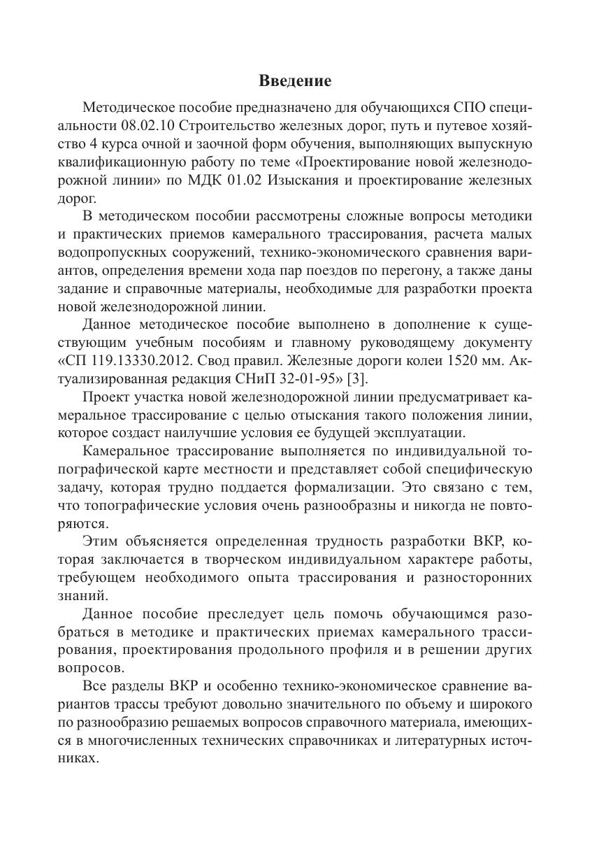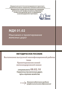 Методическое пособие предназначено для обучающихся СПО специальности 08.02.10 Строительство железных дорог, путь и путевое хозяйство 4 курса очной и заочной форм обучения, выполняющих выпускную квалификационную работу по теме «Проектирование новой железнодорожной линии» по МДК 01.02 Изыскания и проектирование железных дорог. В методическом пособии рассмотрены сложные вопросы методики и практических приемов камерального трассирования, расчета малых водопропускных сооружений, технико-экономического сравнения вариантов, определения времени хода пар поездов по перегону, а также даны задание и справочные материалы, необходимые для разработки проекта новой железнодорожной линии. Данное методическое пособие выполнено в дополнение к существующим учебным пособиям и главному руководящему документу «СП 119.13330.2012. Свод правил. Железные дороги колеи 1520 мм. Актуализированная редакция СНиП 32-01-95» [3].