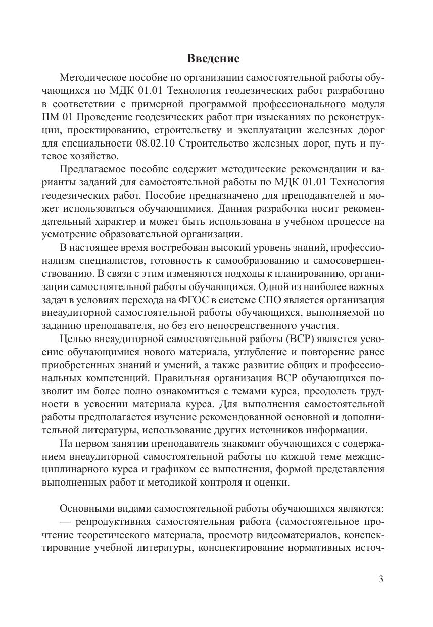 Предлагаемое пособие содержит методические рекомендации и варианты заданий для самостоятельной работы по МДК 01.01 Технология геодезических работ. Пособие предназначено для преподавателей и может использоваться обучающимися. Данная разработка носит рекомендательный характер и может быть использована в учебном процессе на усмотрение образовательной организации.
