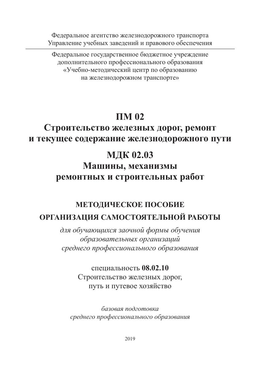 Меринов, А.И. ПМ 02 Строительство железных дорог, ремонт и текущее содержание железнодорожного пути МДК 02.03 Машины, механизмы ремонтных и строительных работ : методическое пособие / А. И. Меринов. — Москва : ФГБУ ДПО «Учебно-методический центр по образованию на железнодорожном транспорте», 2019. — 40 с. — Текст : электронный // УМЦ ЖДТ : электронная библиотека. — URL: https://umczdt.ru/books/1257/234838/ (дата обращения 17.04.2026). — Режим доступа: по подписке.