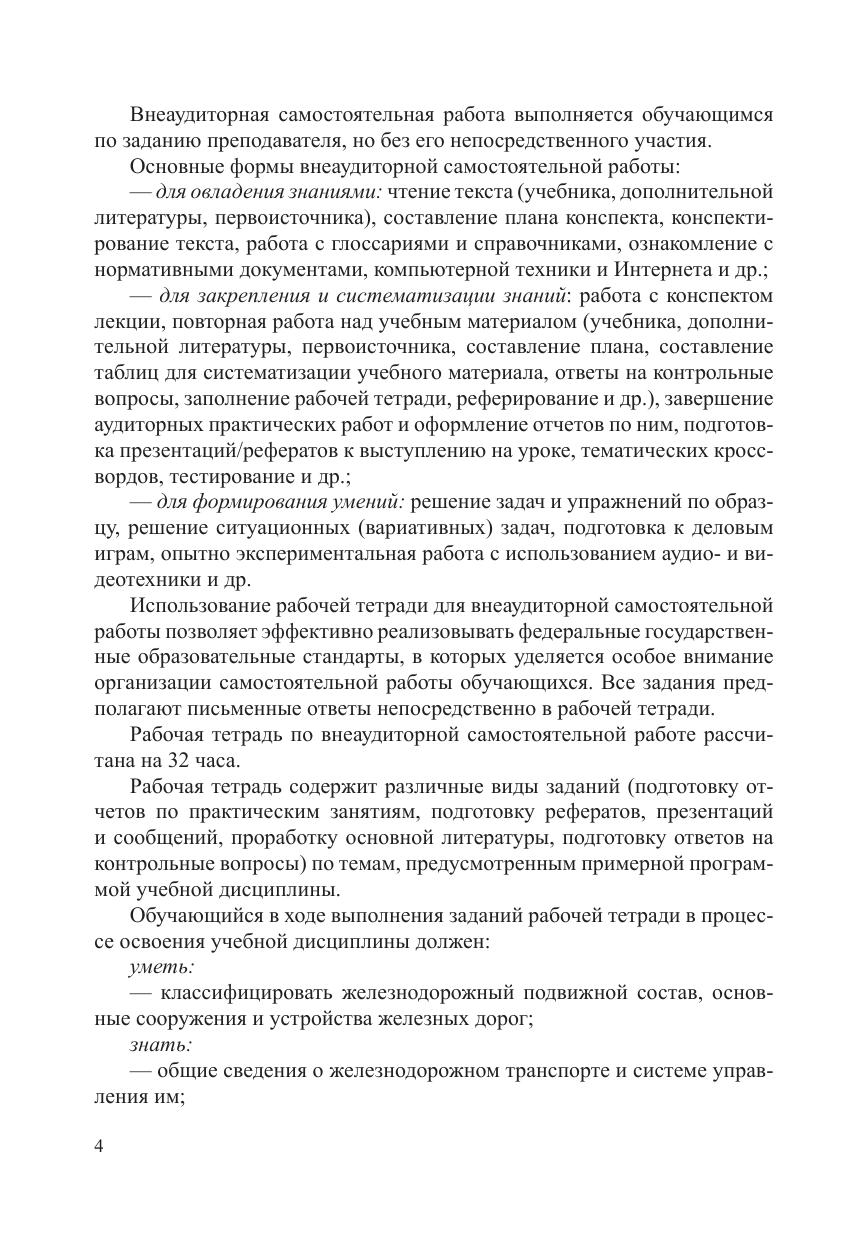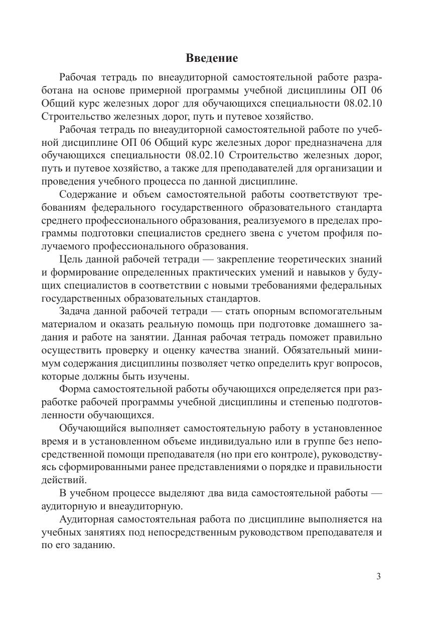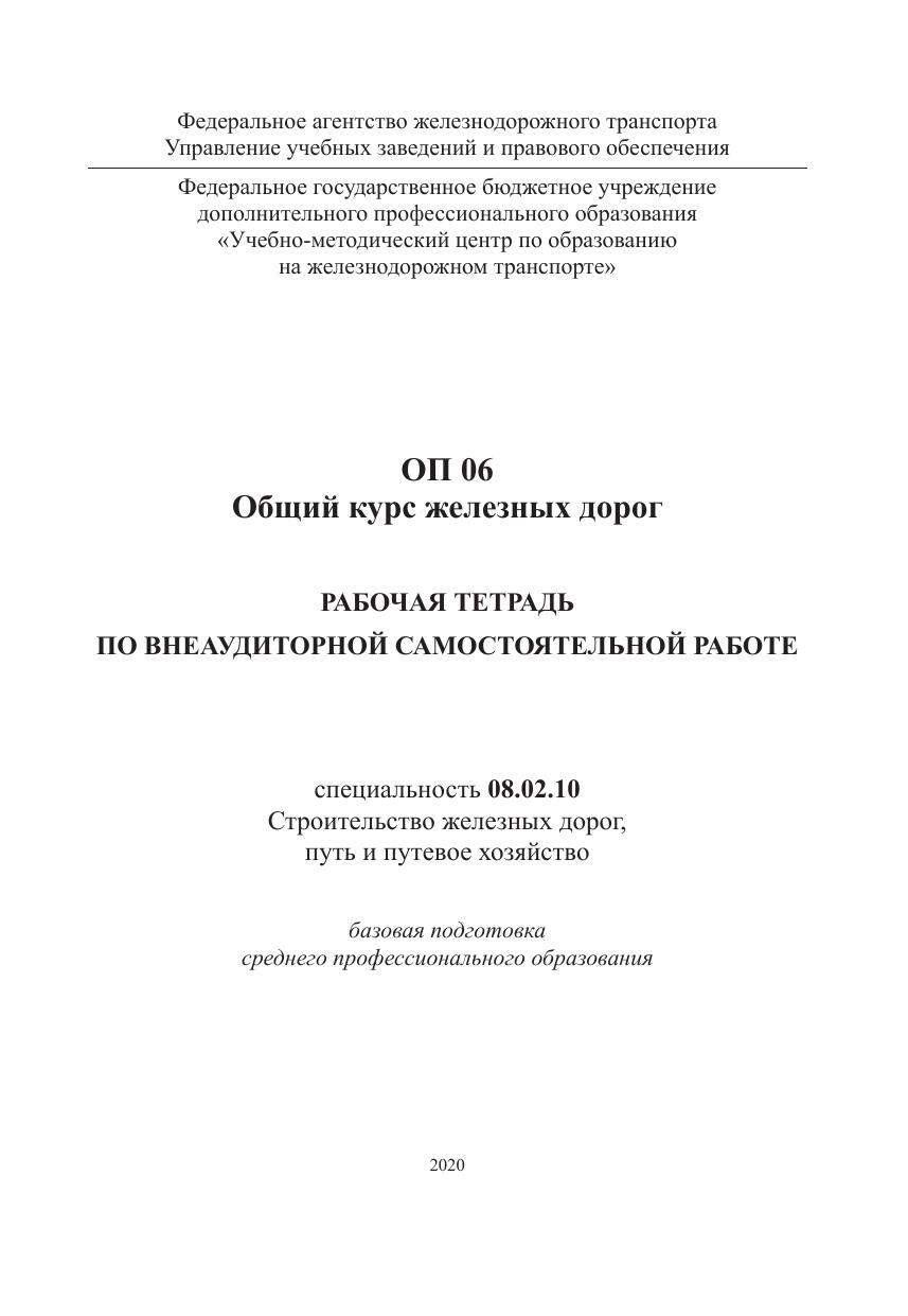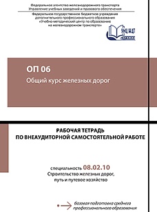 Рабочая тетрадь по внеаудиторной самостоятельной работе разработана на основе примерной программы учебной дисциплины ОП 06 Общий курс железных дорог для обучающихся специальности 08.02.10 Строительство железных дорог, путь и путевое хозяйство. Цель данной рабочей тетради — закрепление теоретических знаний и формирование определенных практических умений и навыков у будущих специалистов в соответствии с новыми требованиями федеральных государственных образовательных стандартов. Задача данной рабочей тетради — оказать реальную помощь при подготовке домашнего задания и работе на занятии. Данная рабочая тетрадь поможет правильно осуществить проверку и оценку качества знаний. Обязательный минимум содержания дисциплины позволяет четко определить круг вопросов, которые должны быть изучены.