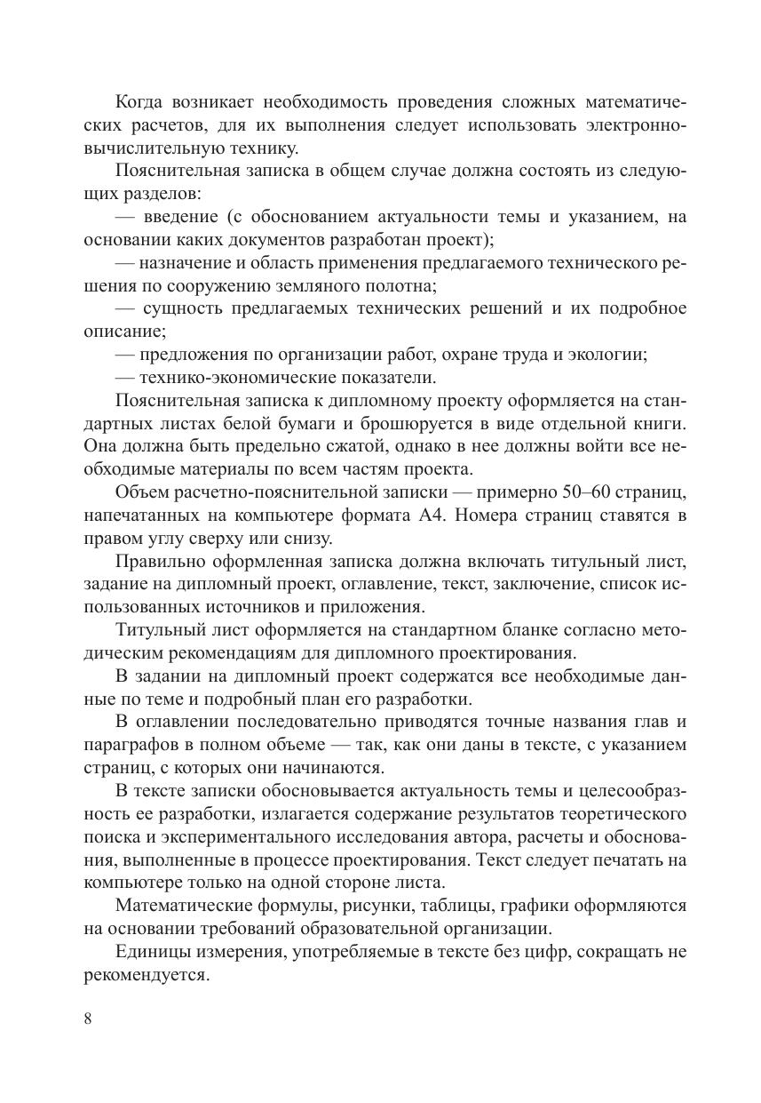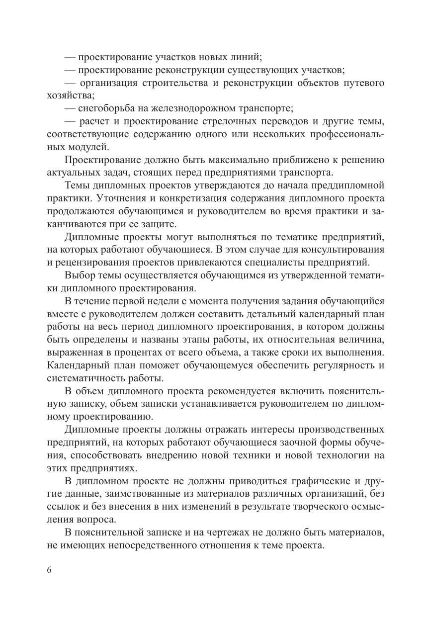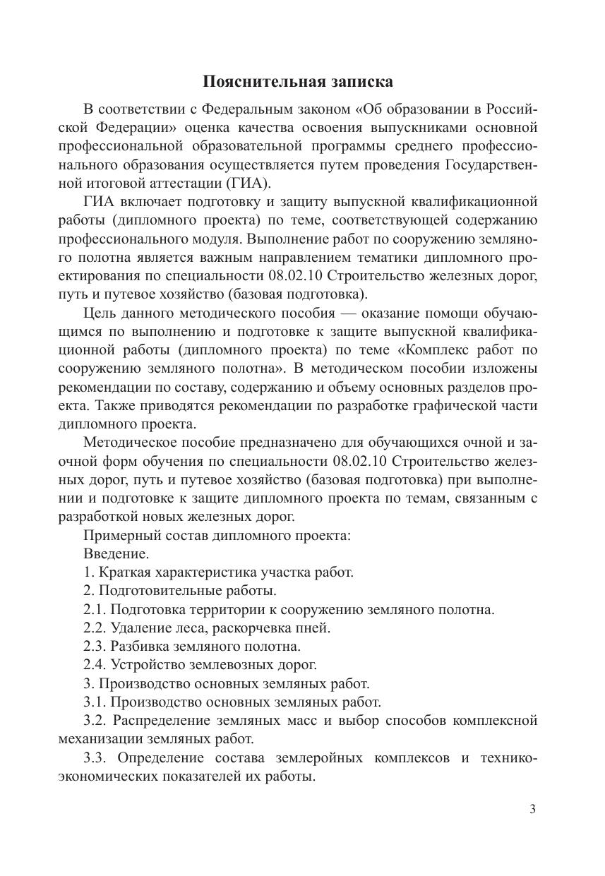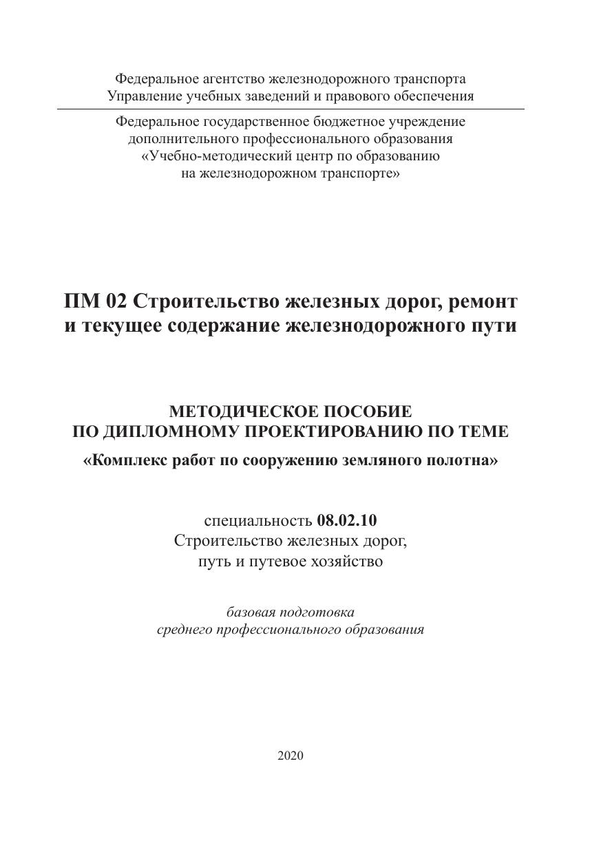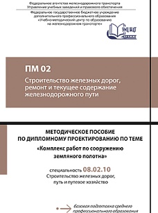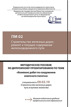 Методическое пособие предназначено для обучающихся очной и заочной форм обучения по специальности 08.02.10 Строительство железных дорог, путь и путевое хозяйство (базовая подготовка) при выполнении и подготовке к защите дипломного проекта по темам, связанным с разработкой новых железных дорог. Цель   пособия — оказание помощи обучающимся по выполнению и подготовке к защите выпускной квалификационной работы (дипломного проекта) по теме «Комплекс работ по сооружению земляного полотна». В  пособии изложены рекомендации по составу, содержанию и объему основных разделов проекта, приводятся рекомендации по разработке графической части дипломного проекта.