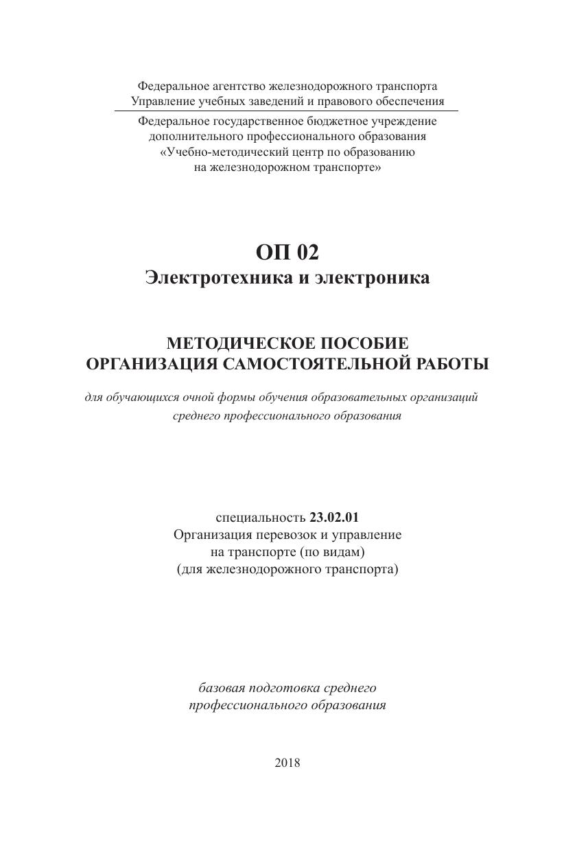 Пешина, Л.В. ОП 02 Электротехника и электроника. МП "Организация самостоятельной работы" : методическое пособие / Л. В. Пешина. — Москва : ФГБУ ДПО «Учебно-методический центр по образованию на железнодорожном транспорте», 2018. — 72 с. — Текст : электронный // УМЦ ЖДТ : электронная библиотека. — URL: https://umczdt.ru/books/1258/223451/ (дата обращения 30.04.2026). — Режим доступа: по подписке.