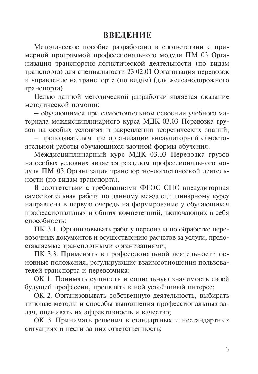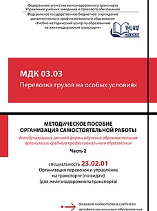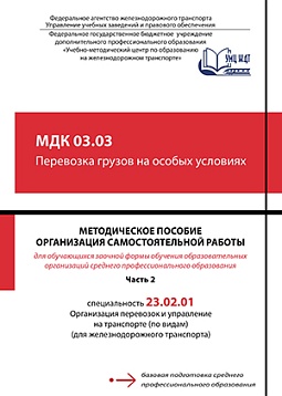 Методическое пособие разработано в соответствии с примерной программой профессионального модуля ПМ 03 Организация транспортно-логистической деятельности (по видам транспорта) для специальности 23.02.01 Организация перевозок и управление на транспорте (по видам) (для железнодорожного транспорта). Во второй части пособия даны методические рекомендации по организации самостоятельной работы по Темам 3.4 – 3.5 примерной программы МДК 03.03 Перевозка грузов на особых условиях. Во всех темах приведены задания для ВСР по каждой подтеме, а также краткий теоретический материал, рекомендуемые источники информации, методические указания по изучению теоретических вопросов и решению практических задач. Для обеспечения самоконтроля самостоятельной работы обучающихся в пособии приведены ответы к тестовым заданиям и примеры решения практических задач. Методическое пособие позволит обучающимся заочной формы обучения самостоятельно усвоить необходимую информацию по междисциплинарному курсу и научиться правильно выполнять учебные задания.