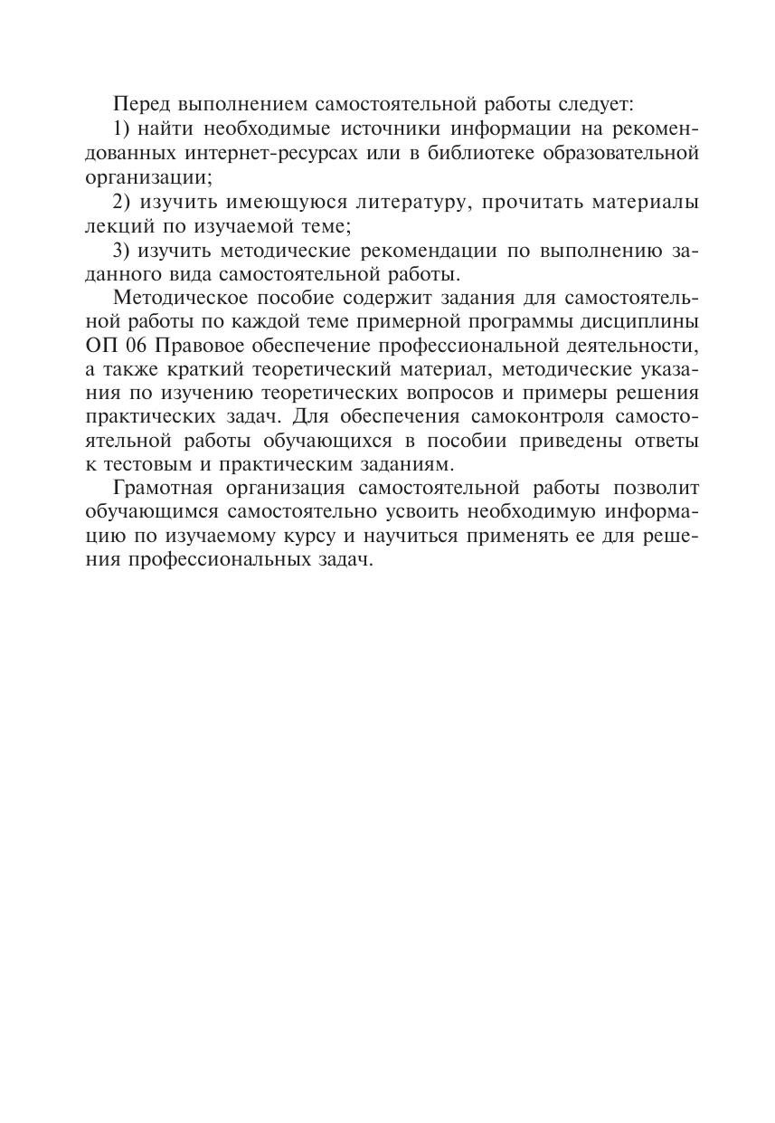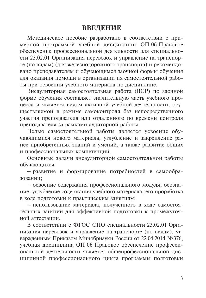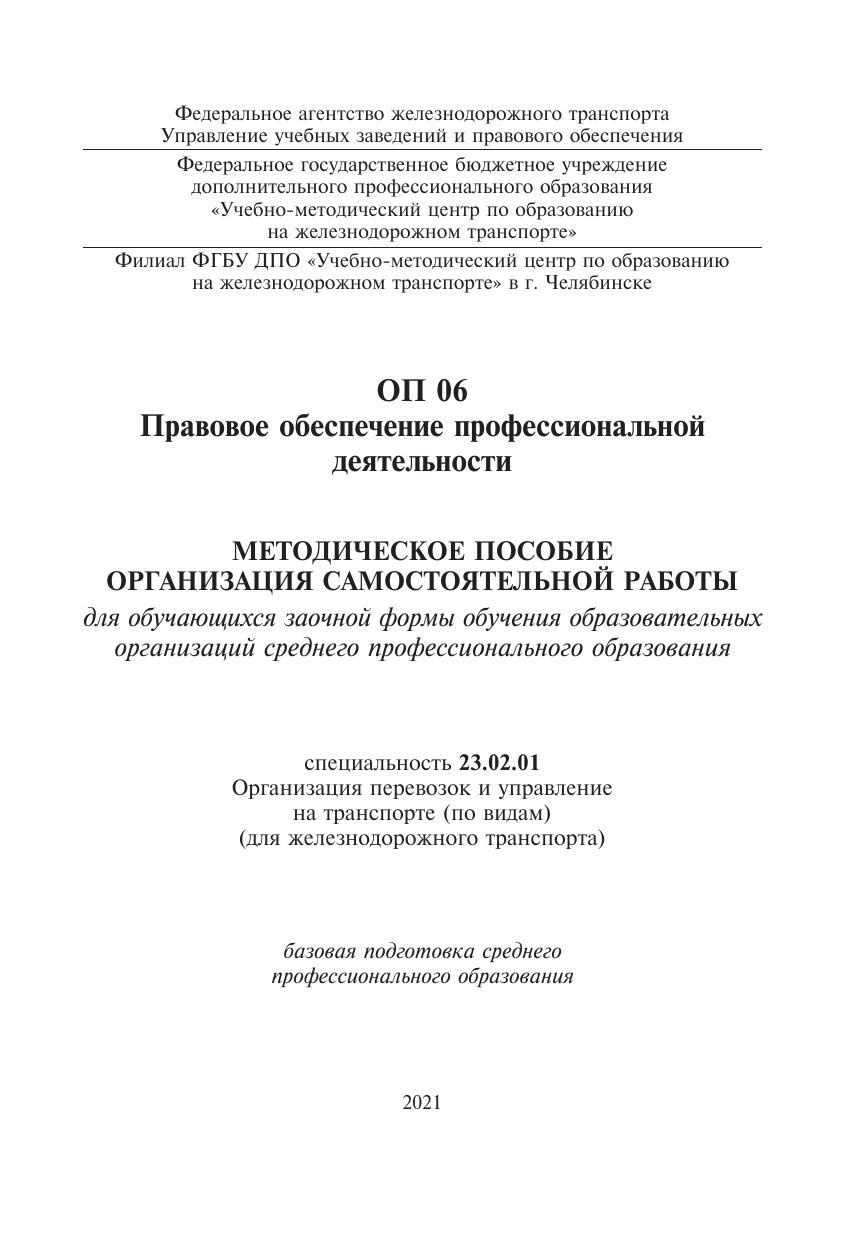 Методическое пособие разработано в соответствии с примерной программой учебной дисциплины ОП 06 Правовое обеспечение профессиональной деятельности для специальности 23.02.01 Организация перевозок и управление на транспорте (по видам) (для железнодорожного транспорта) и рекомендовано преподавателям и обучающимся заочной формы обучения для оказания помощи в организации их самостоятельной работы при освоении учебного материала по дисциплине.