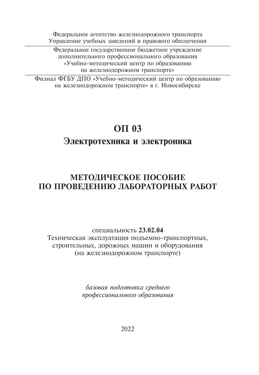 Воробьева, И.В. Методическое пособие по проведению лабораторных работ ОП 03 Электротехника и электроника : / И. В. Воробьева. — Москва : УМЦ ЖДТ, 2022. — 80 с. — Текст : электронный // УМЦ ЖДТ : электронная библиотека. — URL: https://umczdt.ru/books/1258/260562/ (дата обращения 14.04.2026). — Режим доступа: по подписке.