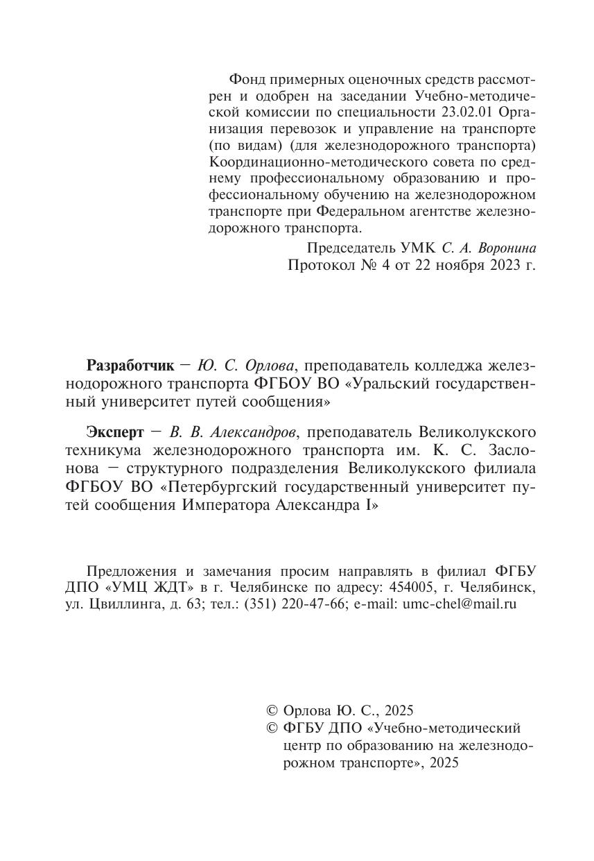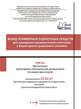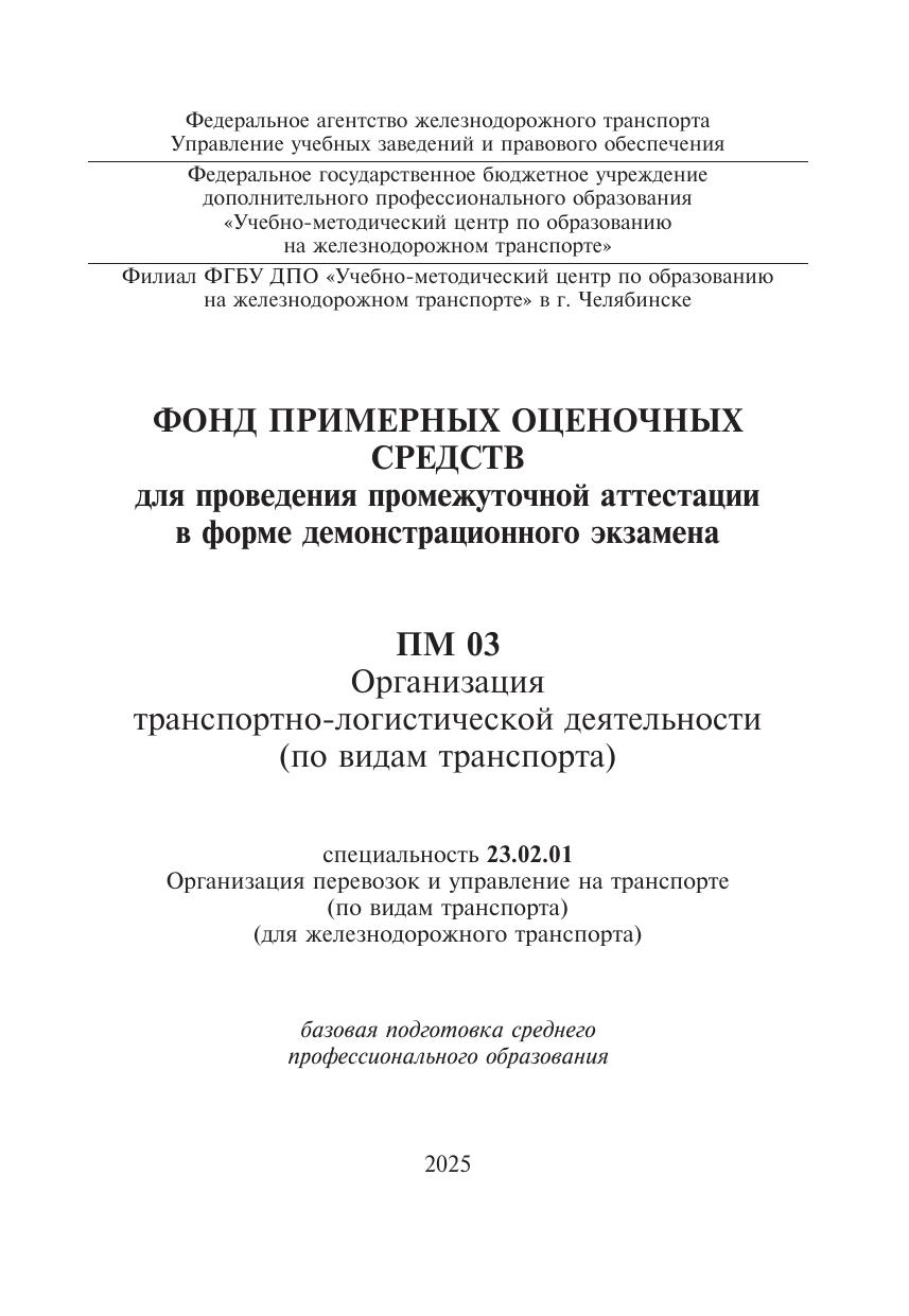 Орлова, Ю.С. Фонд примерных оценочных средств для проведения промежуточной аттестации в форме демонстрационного экзамена ПМ 03 Организация транспортно-логистической деятельности (по видам транспорта) : фонд оценочных средств / Ю. С. Орлова. — Москва : УМЦ ЖДТ, 2025. — 48 с. — Текст : электронный // УМЦ ЖДТ : электронная библиотека. — URL: https://umczdt.ru/books/1258/296664/ (дата обращения 11.02.2026). — Режим доступа: по подписке.